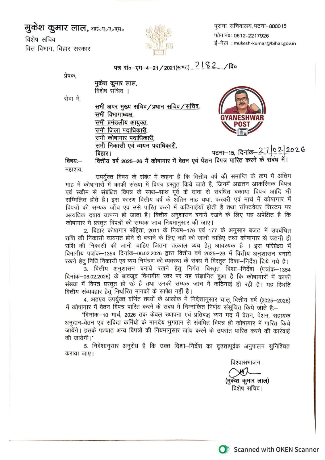 बिहार के विशेष सचिव मुकेश कुमार लाल के अनुसार राज्य में उत्पन्न वित्तीय संकट के कारण सरकारी खर्चों पर नियंत्रण