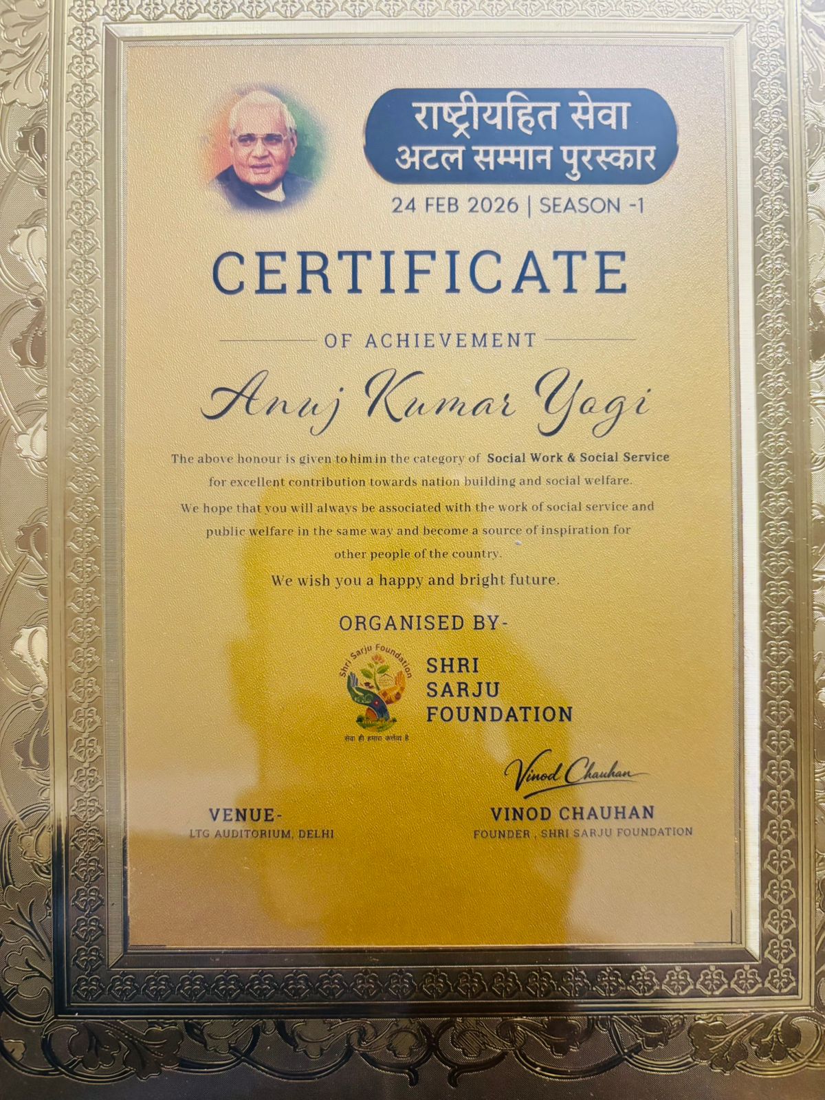 उत्कृष्ट जनसेवा के लिए अनुज योगी को मिला अटल पुरस्कार