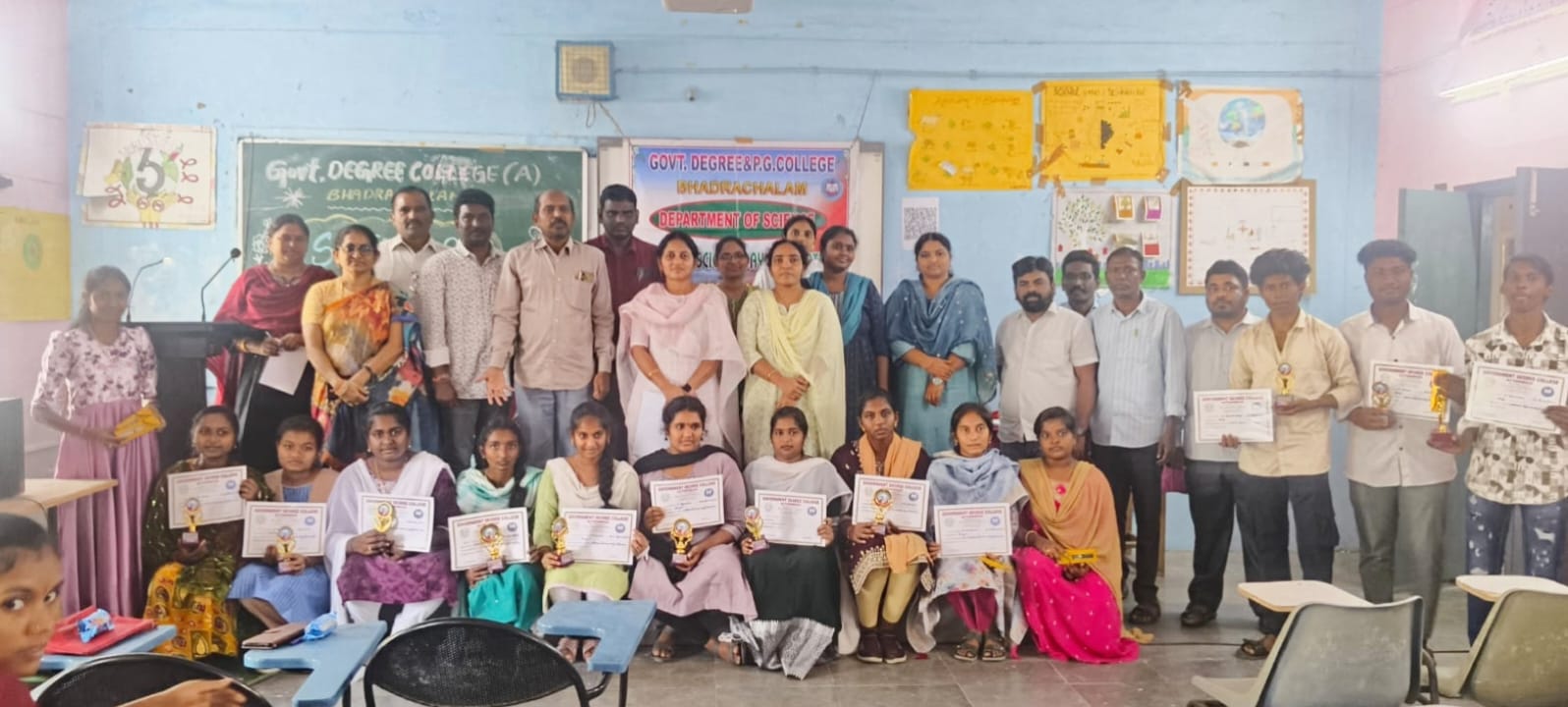 ప్రభుత్వ డిగ్రీ కళాశాల, భద్రాచలం నందు జాతీయ సైన్స్ దినోత్సవం వేడుకలు ఘనంగా నిర్వహించడం జరిగిందని ప్రభుత్వ డిగ్రీ కళాశాల ప్రిన్సిపాల్ డాక్టర్ జాన్ మిల్టన్ అన్నారు. శనివారం నాడు భద్రాచలం పట్టణంలోని ప్రభుత్వ డిగ్రీ కళాశాలలో జాతీయ సైన్స్ దినోత్సవం సందర్భంగా నోబెల్ బహుమతి గ్రహీత అయిన సి.వి రామన్ చిత్రపటానికి పూలమాల వేసి నివాళులు అర్పించిన అనంతరం ప్రిన్సిపాల్ మాట్లాడుతూ సి.వి రామన్ కాంతి పైన చేసిన పరిశోధనకు గాను 1930 సంవత్సరంలో నోబెల్ బహుమతి వచ్చిందని విద్యార్థులకు తెలియజేశారు. విద్యార్థులందరూ సి.వి రామన్ ను ఆదర్శంగా తీసుకొని ఉన్నతమైన స్థానానికి ఎదగాలని ఆకాంక్షించారు. జాతీయ సైన్స్ దినోత్సవం సందర్భంగా విద్యార్థినీ విద్యార్థులు రంగోలి , వకృత్వ పోటీ, వ్యాసరచన పోటీ మరియు పోస్టర్ ప్రజెంటేషన్ పోటీలలో గెలుపొందిన విద్యార్థినీ విద్యార్థులకు బహుమతులు అందజేశారు.