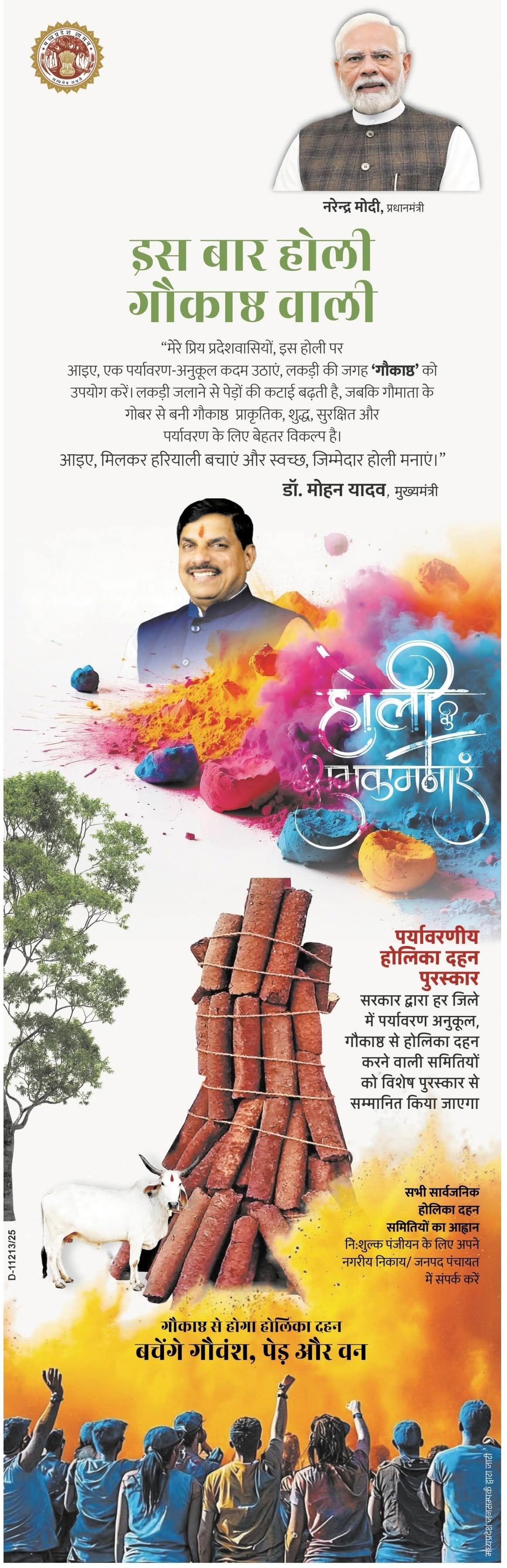 "मेरे प्रिय प्रदेशवासियों, इस होली पर आइए, एक पर्यावरण-अनुकूल कदम उठाएं, लकड़ी की जगह 'गौकाष्ठ' को उपयोग करें। लकड़ी जलाने से पेड़ों की कटाई बढ़ती है, जबकि गौमाता के गोबर से बनी गौकाष्ठ प्राकृतिक, शुद्ध, सुरक्षित और पर्यावरण के लिए बेहतर विकल्प है। आइए, मिलकर हरियाली बचाएं और स्वच्छ, जिम्मेदार होली मनाएं।"