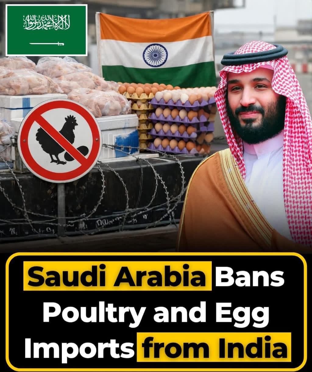 ছৌদি আৰবে এভিয়ান ইনফ্লুৱেঞ্জা (বাৰ্ড ফ্লু)ৰ প্ৰাদুৰ্ভাৱৰ সৈতে জড়িত জনস্বাস্থ্যৰ উদ্বেগ প্ৰকাশ কৰি ভাৰতৰ পৰা হাঁহ-কুকুৰা আৰু টেবুল কণী আমদানি কৰাত সাময়িক নিষেধাজ্ঞা আৰোপ কৰিছে।