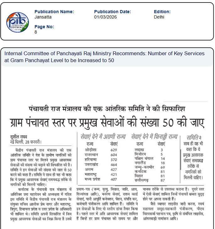 माननीय प्रधानमंत्री जी के विज़न के अनुरूप, पंचायती राज मंत्रालय (#MoPR) ग्राम पंचायतों में सेवा प्रदाय #ServiceDelivery को #सुशासन की मज़बूत आधारशिला के रूप में विकसित कर रहा है। मंत्रालय का निरंतर प्रयास है कि ग्राम पंचायतें नागरिक-केंद्रित, समयबद्ध और प्रौद्योगिकी-सक्षम संस्थाओं के रूप में और अधिक सशक्त बनें।