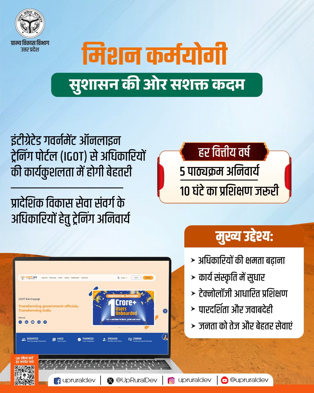 इसी क्रम में iGOT Karmayogi (Integrated Government Online Training Portal) के माध्यम से प्रादेशिक विकास सेवा संवर्ग के अधिकारियों के लिए प्रशिक्षण को अनिवार्य किया गया है। यह पहल न केवल प्रशासनिक दक्षता को सशक्त करेगी, बल्कि सुशासन की दिशा में एक मजबूत और दीर्घकालिक परिवर्तन भी सुनिश्चित करेगी।