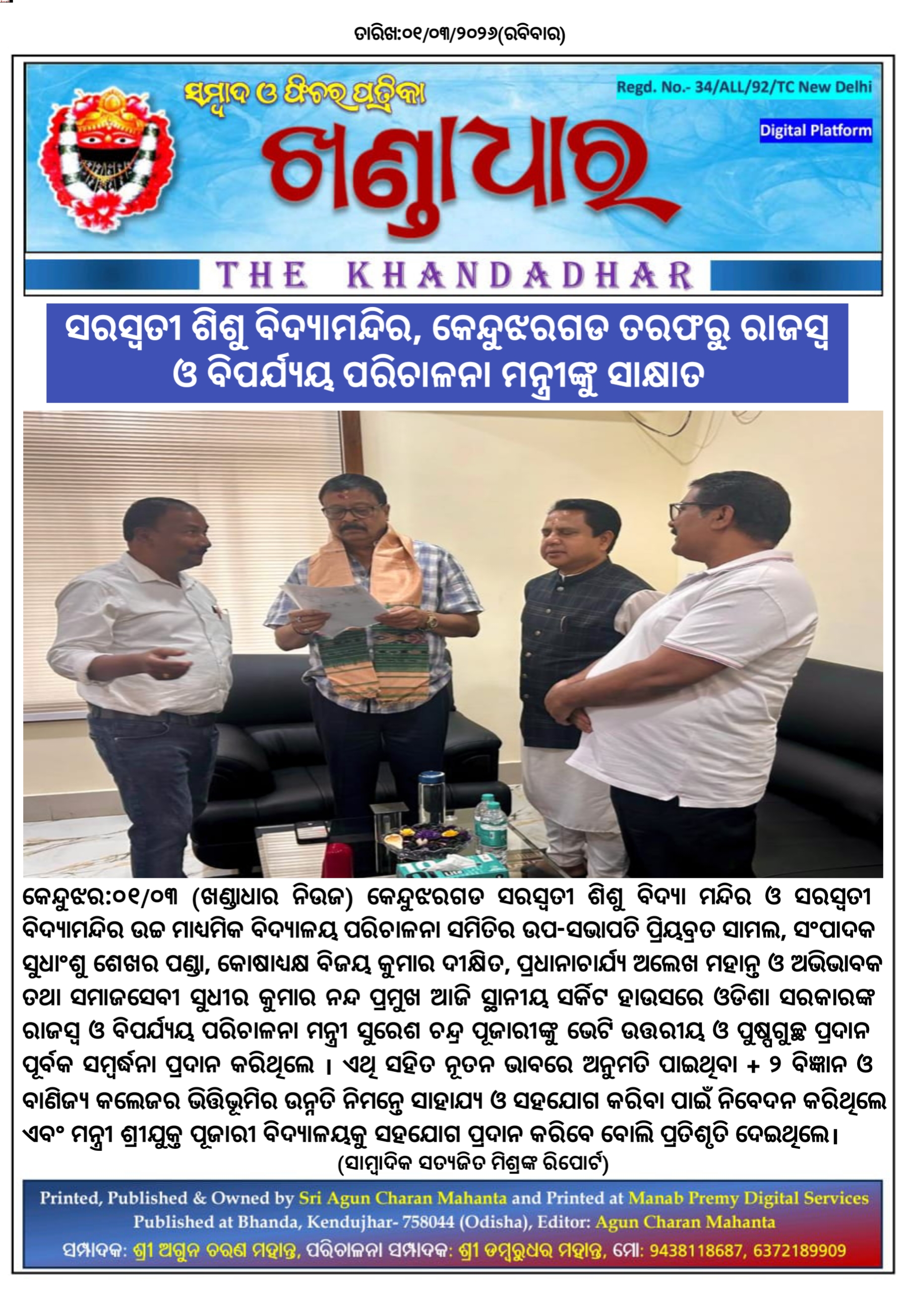 କେନ୍ଦୁଝର:୦୧/୦୩- କେନ୍ଦୁଝରଗଡ ସରସ୍ୱତୀ ଶିଶୁ ବିଦ୍ୟା ମନ୍ଦିର ଓ ସରସ୍ଵତୀ ବିଦ୍ୟାମନ୍ଦିର ଉଚ୍ଚ ମାଧ୍ୟମିକ ବିଦ୍ୟାଳୟ ପରିଚାଳନା ସମିତିର ଉପ-ସଭାପତି ପ୍ରିୟବ୍ରତ ସାମଲ, ସଂପାଦକ ସୁଧାଂଶୁ ଶେଖର ପଣ୍ଡା, କୋଷଧ୍ୟକ୍ଷ ବିଜୟ କୁମାର ଦୀକ୍ଷିତ, ପ୍ରଧାନାଚାର୍ଯ୍ୟ ଅଲେଖ ମହାନ୍ତ ଓ ଅଭିଭାବକ ତଥା ସମାଜସେବୀ ସୁଧୀର କୁମାର ନନ୍ଦ ପ୍ରମୁଖ ଆଜି ସ୍ଥାନୀୟ ସର୍କିଟ ହାଉସରେ ଓଡିଶା ସରକାରଙ୍କ ରାଜସ୍ୱ ଓ ବିପର୍ଯ୍ୟୟ ପରିଚାଳନା ମନ୍ତ୍ରୀ ସୁରେଶ ଚନ୍ଦ୍ର ପୂଜାରୀଙ୍କୁ ଭେଟି ଉତ୍ତରୀୟ ଓ ପୁଷ୍ପଗୁଚ୍ଛ ପ୍ରଦାନ ପୂର୍ବକ ସମ୍ବର୍ଦ୍ଧନା ପ୍ରଦାନ କରିଥିଲେ । ଏଥି ସହିତ ନୂତନ ଭାବରେ ଅନୁମତି ପାଇଥିବା + ୨ ବିଜ୍ଞାନ ଓ ବାଣିଜ୍ୟ କଲେଜର ଭିତ୍ତିଭୂମିର ଉନ୍ନତି ନିମନ୍ତେ ସାହାଯ୍ୟ ଓ ସହଯୋଗ କରିବା ପାଇଁ ନିବେଦନ କରିଥିଲେ ଏବଂ ମନ୍ତ୍ରୀ ଶ୍ରୀଯୁକ୍ତ ପୂଜାରୀ ବିଦ୍ୟାଳୟକୁ ସହଯୋଗ ପ୍ରଦାନ କରିବେ ବୋଲି ପ୍ରତିଶୃତି ଦେଇଥିଲେ।