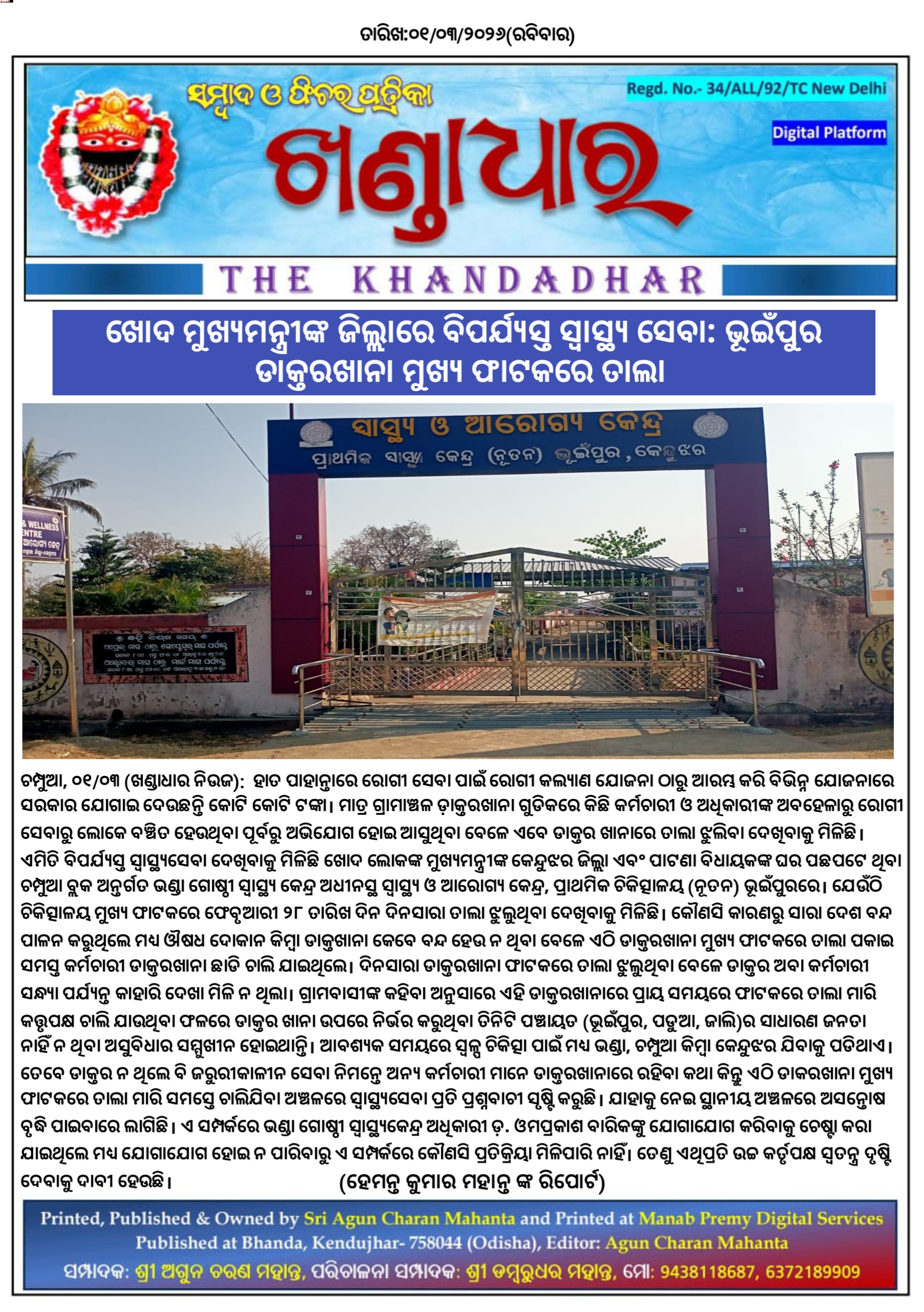 ଖୋଦ ମୁଖ୍ୟମନ୍ତ୍ରୀଙ୍କ ଜିଲ୍ଲାରେ ବିପର୍ଯ୍ୟସ୍ତ ସ୍ୱାସ୍ଥ୍ୟ ସେବା : ଭୂଇଁପୁର ଡାକ୍ତରଖାନା ମୁଖ୍ୟ ଫାଟକରେ ତାଲା।