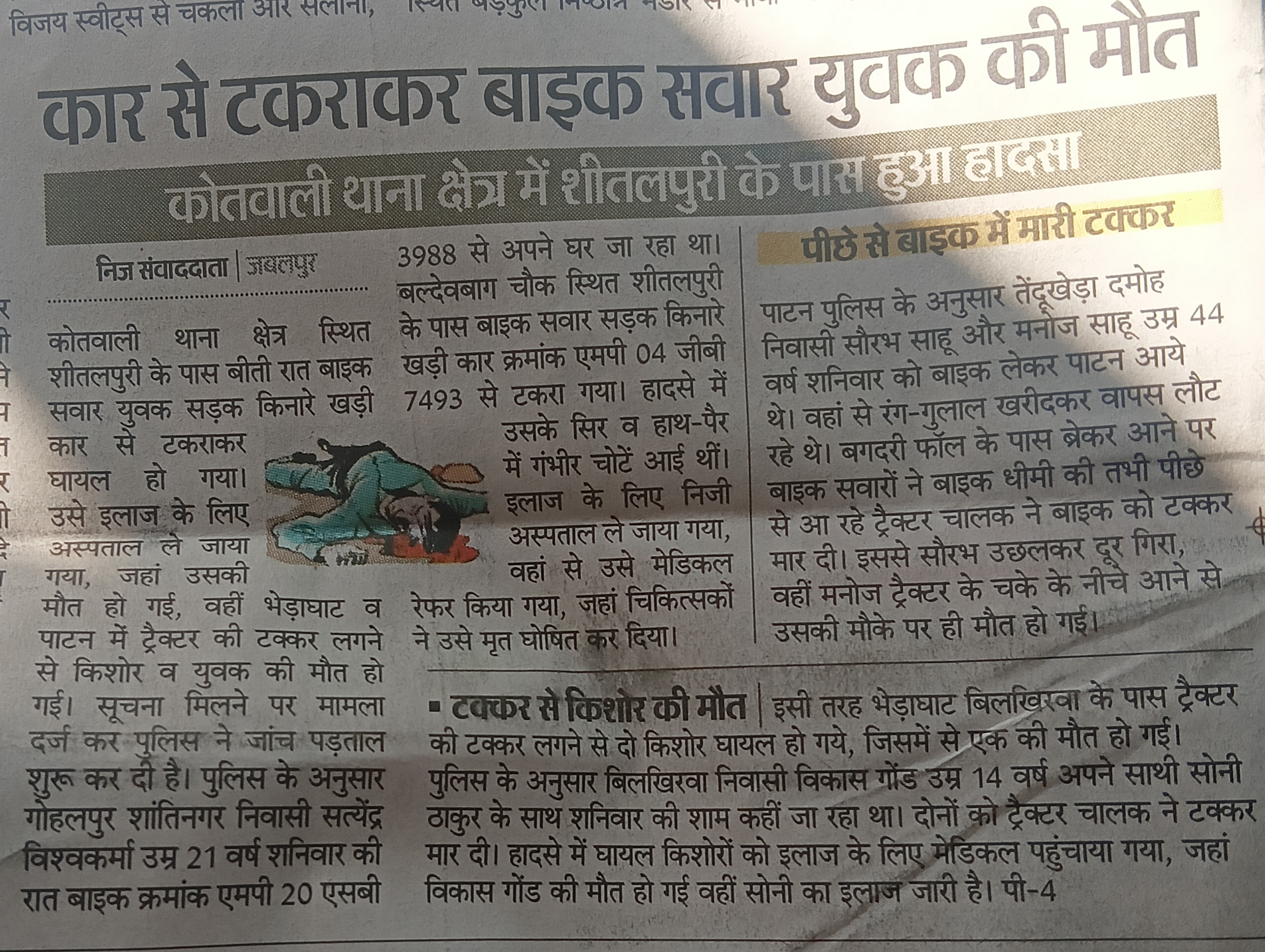 कोतवाली थाना का क्षेत्र में शीतलपुरी के पास हुआ हादसा