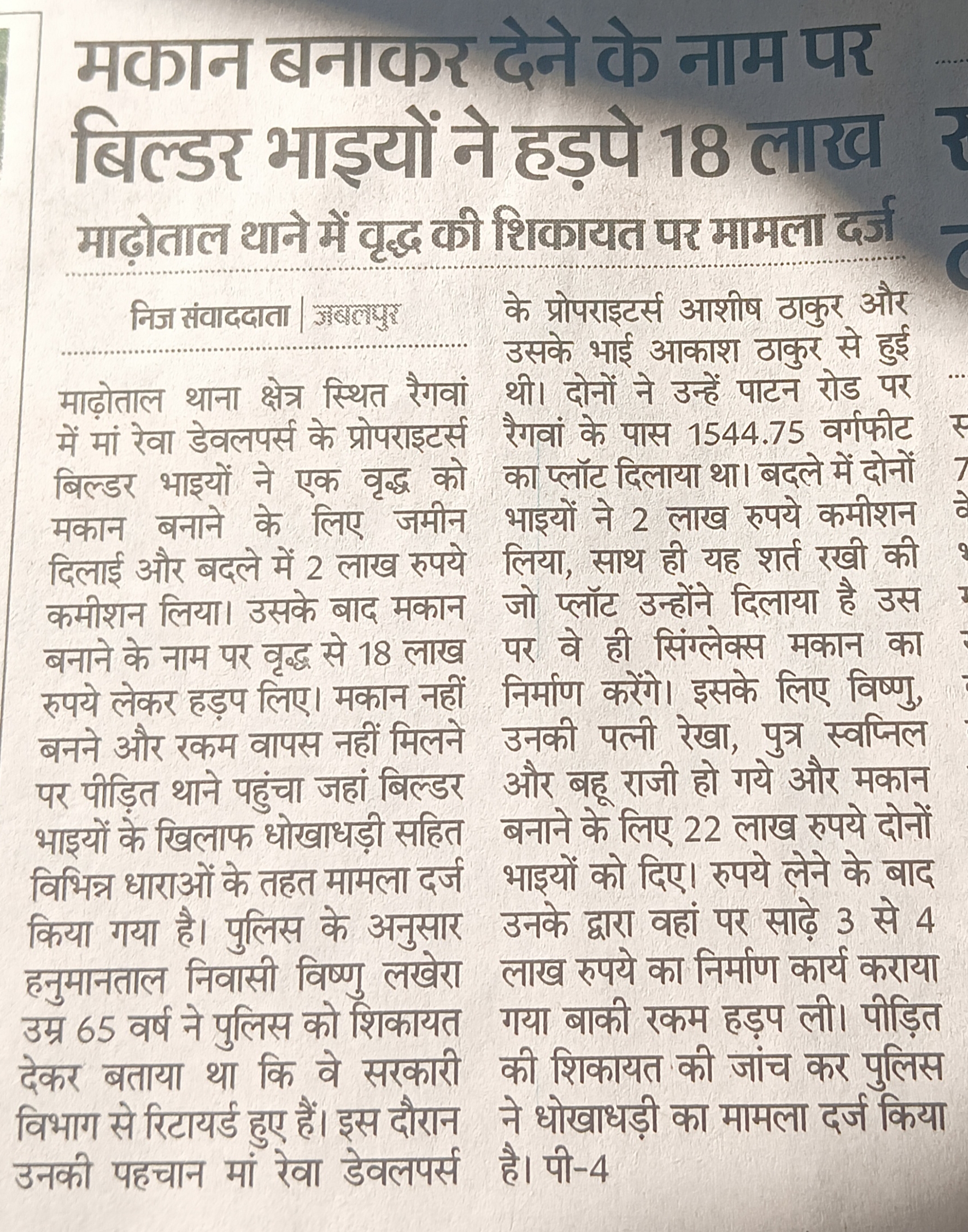 मकान बनाकर देने के नाम पर बिल्डर भाइयों ने हडपे18 लाख रुपए