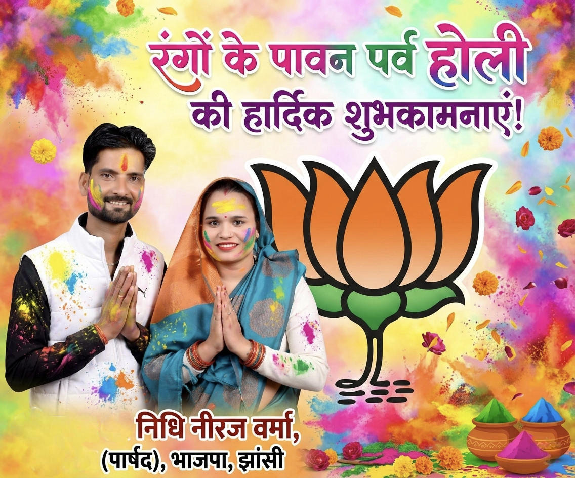 झांसी के वार्ड संख्या 20 से भारतीय जनता पार्टी (भाजपा) की लोकप्रिय सभासद श्रीमती निधि नीरज वर्मा ने रंगों के पावन पर्व 'होली' के शुभ अवसर पर समस्त क्षेत्रवासियों एवं झांसी की जनता को हार्दिक बधाई एवं मंगलकामनाएं प्रेषित की हैं। उन्होंने इस त्यौहार को आपसी प्रेम, सद्भाव और सामाजिक समरसता का महान प्रतीक बताया है।