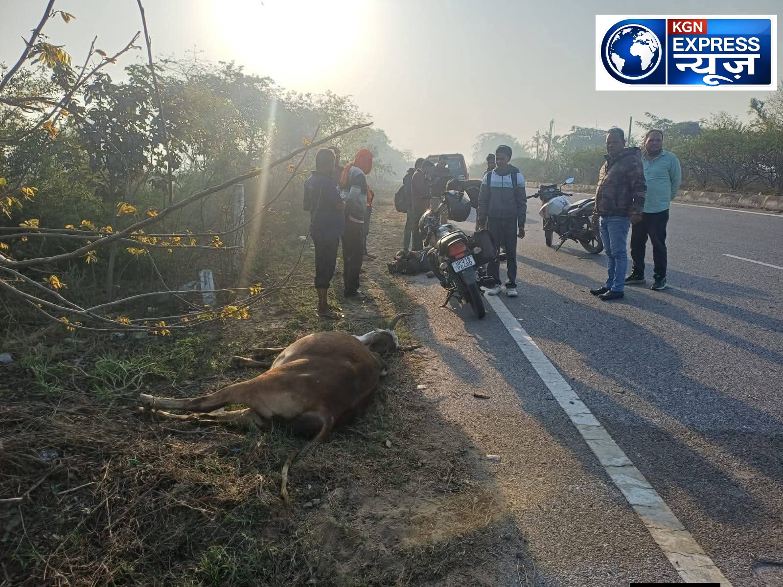 सहसवान-थाना मुजरिया क्षेत्र के अंतर्गत ग्राम सब्दलपुर रोड बदायूं मेरठ राजमार्ग पर अभी-अभी सहसवान की ओर से बदायूं जा रहे बाइक सवार व्यक्ति ने गाय को