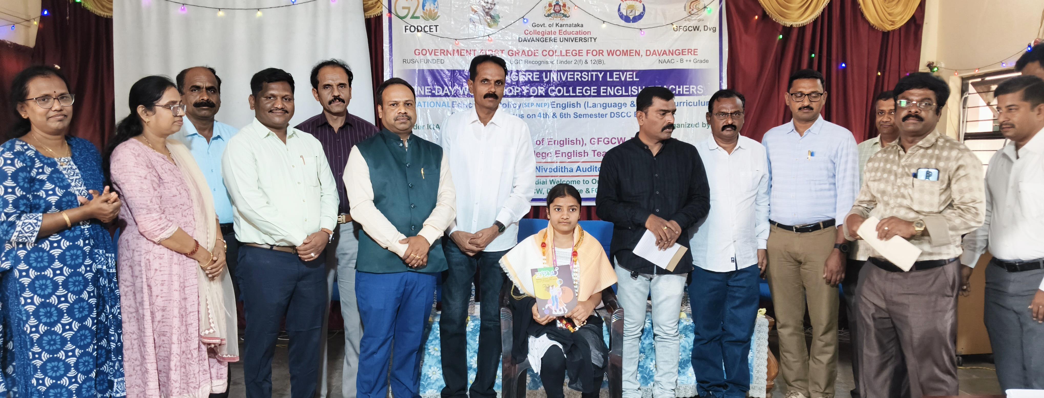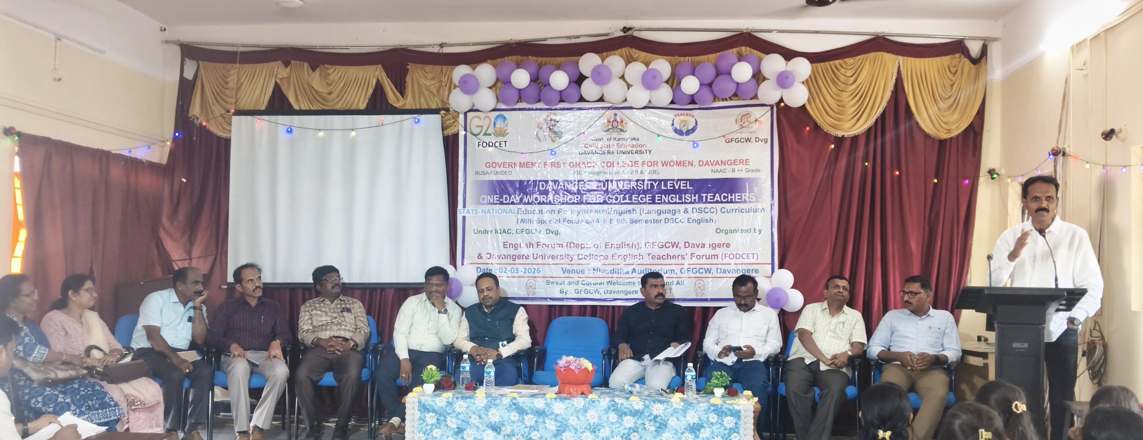 ಸರ್ಕಾರಿ ಪ್ರಥಮ ದರ್ಜೆ ಮಹಿಳಾ ಕಾಲೇಜು, ದಾವಣಗೆರೆ ಹಾಗೂ ದಾವಣಗೆರೆ ವಿಶ್ವವಿದ್ಯಾಲಯದ ಇಂಗ್ಲೀಷ್ ಪ್ರಾಧ್ಯಾಪಕರ ವೇದಿಕೆಯ ಸಂಯುಕ್ತ ಆಶ್ರಯದಲ್ಲಿ “ರಾಜ್ಯ ಶಿಕ್ಷಣ ನೀತಿ (S.E.P) ಇಂಗ್ಲೀಷ್ ಪಠ್ಯಕ್ರಮ” ಕುರಿತ ಒಂದು ದಿನದ ಕಾರ್ಯಗಾರವನ್ನು ದಿನಾಂಕ 02-03-2026 ರಂದು ಉದ್ಘಾಟಿಸಲಾಯಿತು.