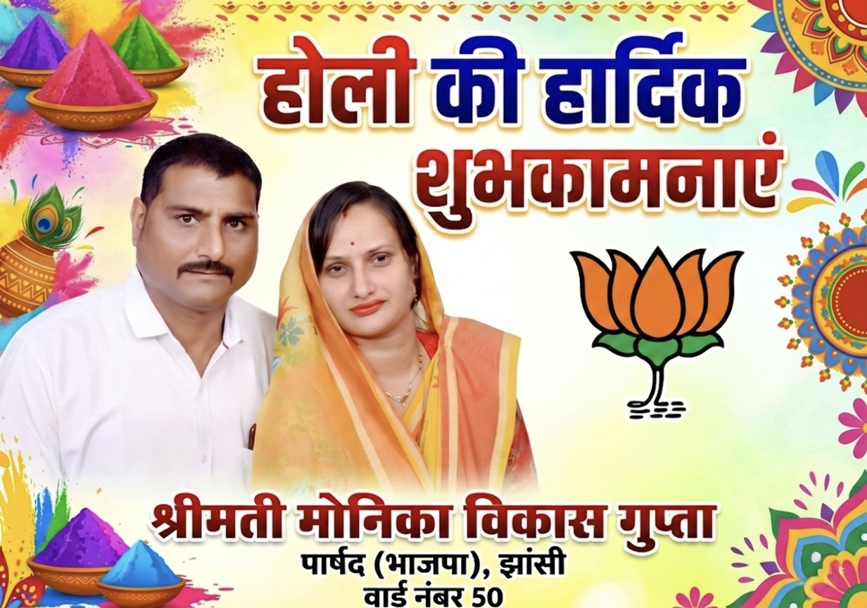 झांसी, 2 मार्च 2026: झांसी के वार्ड संख्या 50 से भारतीय जनता पार्टी (भाजपा) की लोकप्रिय पार्षद श्रीमती मोनिका विकास गुप्ता ने रंगों के महापर्व 'होली' के पावन अवसर पर समस्त वार्डवासियों एवं महानगर की जनता को हार्दिक मंगलकामनाएं प्रेषित की हैं। उन्होंने इस पर्व को भारतीय संस्कृति की गौरवशाली परंपरा और सामाजिक एकता का अनुपम उदाहरण बताया है।