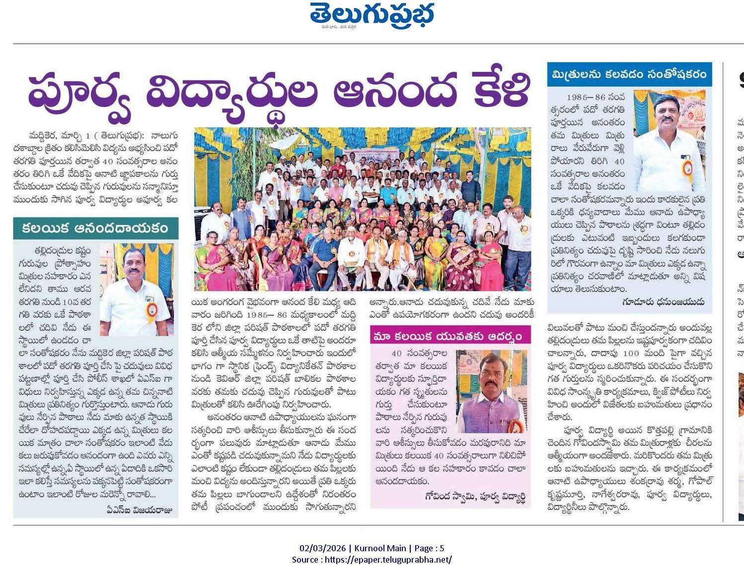 హైదరాబాద్:కర్నూలు జిల్లా మద్దికేర జిల్లా పరిషత్ హై స్కూల్లో 1985 - 86 సంవత్సరంలో పదవ తరగతి పూర్తి చేసుకున్న పూర్వ విద్యార్థులు 40 ఏళ్ల తర్వాత ఆత్మీయ సమ్మేళనం లో కలుసుకున్న సందర్భంగా గురువులను సన్మానించి మరియు వారికి సీల్డ్ ఇవ్వడం జరిగింది. గురువులే సన్మానం చేసినందుకు వారు ఎంతో ఆనందం వ్యక్తపరచడం జరిగింది.