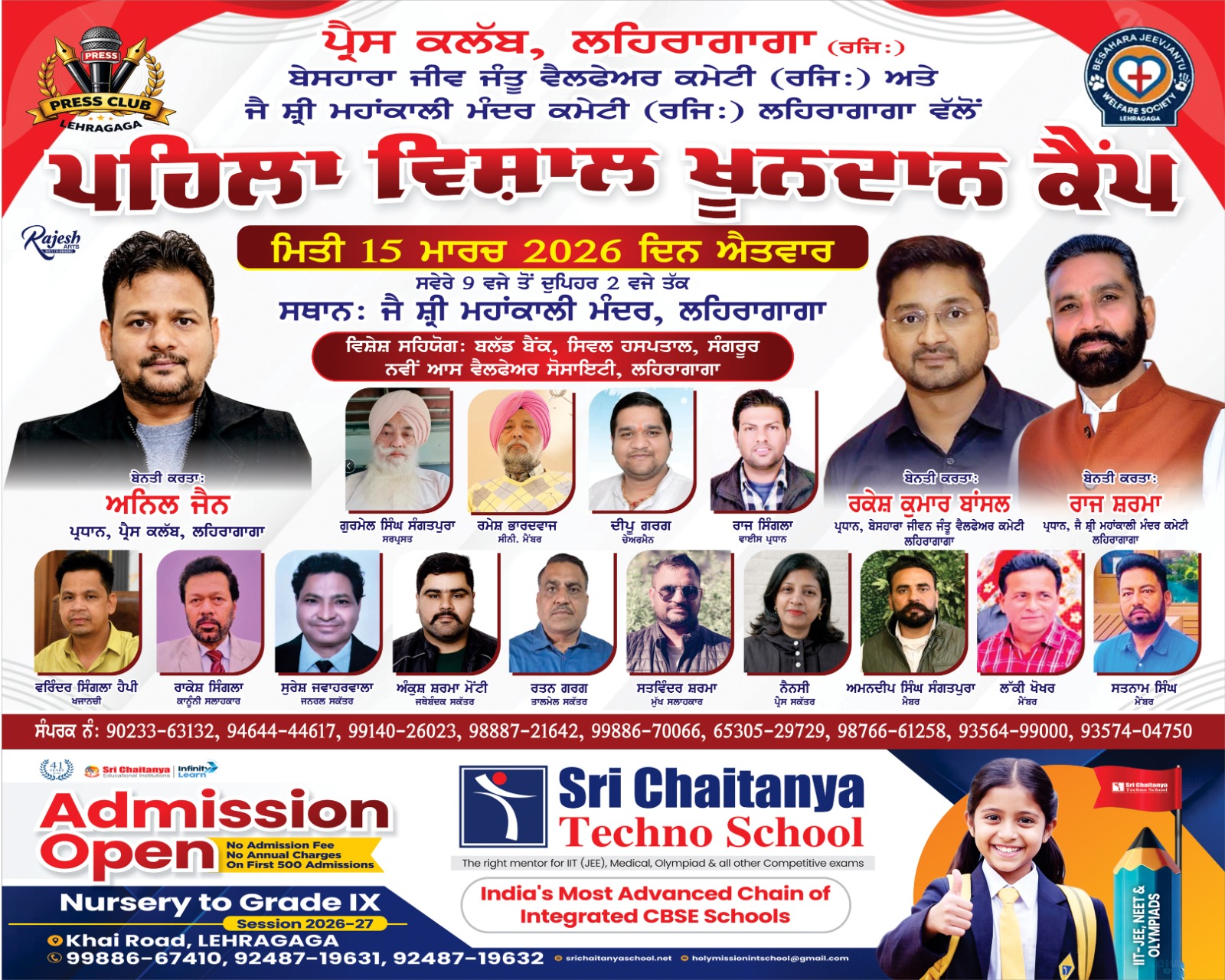 प्रेस क्लब लहरागागा 15 मार्च को काली माता मंदिर में एक बड़ा ब्लड डोनेशन कैंप लगाएगा।