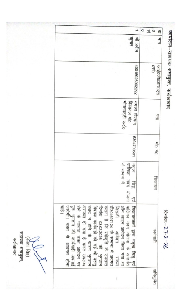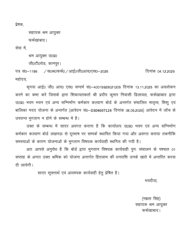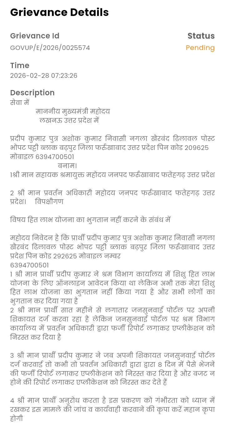 ब्रेकिंगन्यूज़ जिला फर्रुखाबाद में नगला खैरबंद ढिलावल में प्रदीप कुमार के द्वारा श्रम विभाग कार्यालय में शिशु हेतु लाभ योजना का ऑनलाइन आवेदन किया था और दिनांक 10/06/2025 को प्रवर्तन अधिकारी द्वारा जांच भी हो गई थी लेकिन अभी तक प्रार्थी का भुगतान नहीं किया गया भुगतान को लेकर प्रदीप कुमार ने जनसुनवाई पोर्टल पीजी पोर्टल पर 9 महीने से लगातार शिकायत दर्ज करवा रहे हैं लेकिन श्रम विभाग कार्यालय की तरफ से 9 महीने से जनसुनवाई पोर्टल वापी की पोर्टल पर फर्जी रिपोर्ट लगाकर एप्लीकेशन का निस्तारित कर दिया जाता है
