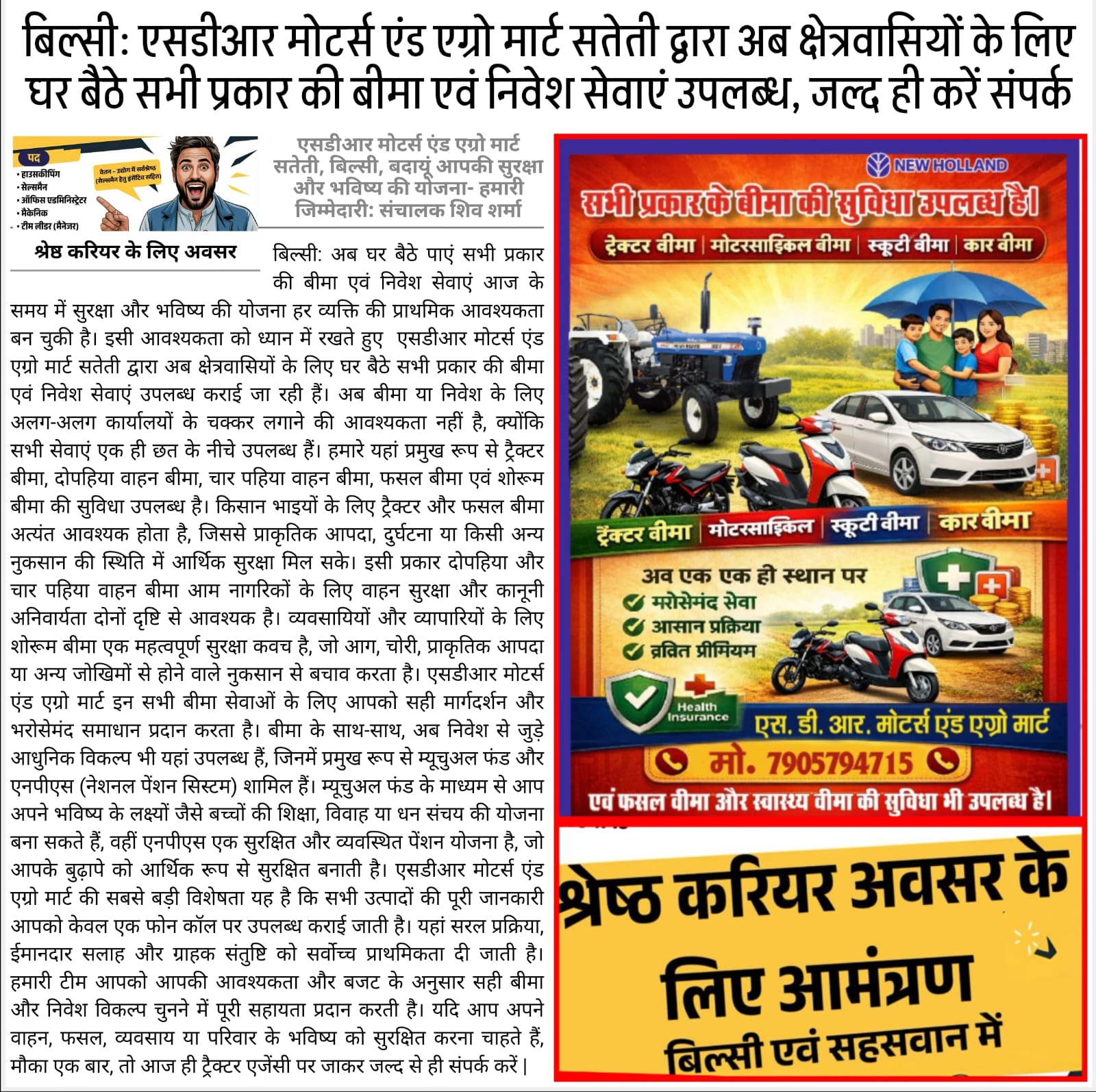 उन्होंने सभी लोगों से अपील करते हुए कहा कि होली का पर्व सुरक्षित, सौहार्दपूर्ण और पर्यावरण के प्रति जागरूक रहते हुए मनाएं। प्राकृतिक रंगों का उपयोग करें, जल की बचत करें और त्योहार की गरिमा बनाए रखें। श्री शिव शर्मा ने विशेष रूप से किसान भाइयों के लिए मंगलकामना करते हुए कहा कि यह होली उनके जीवन में समृद्धि, उन्नति और खुशहाली लेकर आए। उन्होंने कहा कि किसानों की तरक्की ही देश की प्रगति का आधार है और एसडीआर मोटर्स एंड एग्रो मार्ट सदैव किसानों की सेवा और उनके विकास के लिए समर्पित है। अंत में उन्होंने सभी देशवासियों को संदेश देते हुए कहा कि होली का यह पावन पर्व सभी के जीवन में सुख, शांति, स्वास्थ्य और समृद्धि के रंग भर दे।