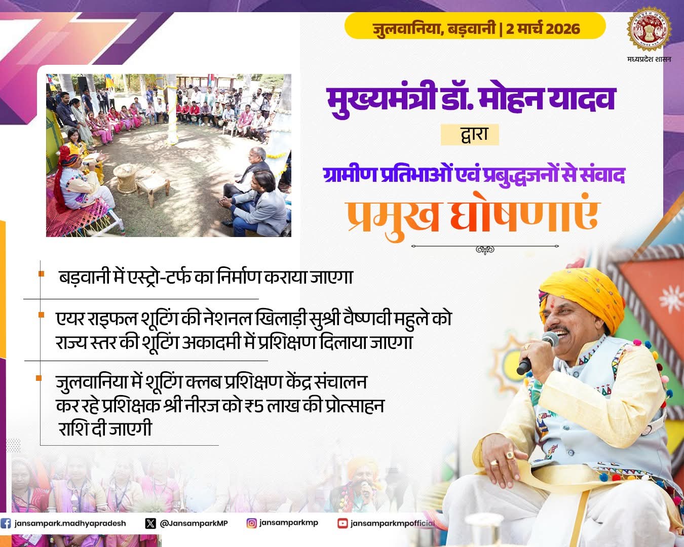 मुख्यमंत्री डॉ मोहन यादव द्वारा बड़वानी जिले के जुलवानिया में ग्रामीण प्रतिभाओं एवं प्रबुद्धजनों से संवाद