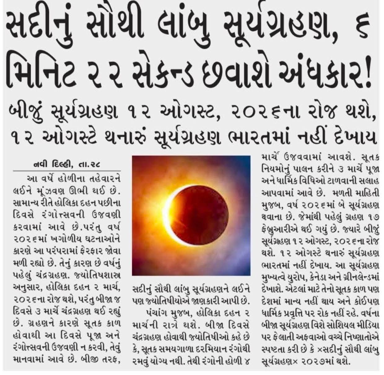 વર્ષ ૨૦૨૬નું પ્રથમ અને મુખ્ય ચંદ્રગ્રહણ ૩ માર્ચ ૨૦૨૬ (હોળી)ના રોજ થશે [૧, ૫]। આ એક પૂર્ણ ચંદ્રગ્રહણ (બ્લડ મૂન) હશે જે બપોરે ૩:૨૦ થી સાંજે ૬:૪૭ સુધી ચાલશે [૩, ૫]। તે ભારત સહિત એશિયા, ઓસ્ટ્રેલિયા, ઉત્તર-મધ્ય અમેરિકામાં દેખાશે, જેના કારણે ભારતમાં ૯ કલાક પહેલાં સૂતક કાળ શરૂ થશે