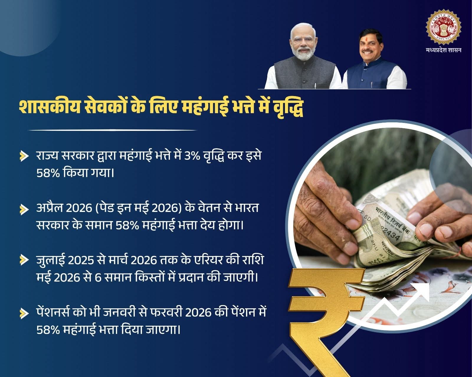 ▶️ अप्रैल 2026 (पेड इन मई 2026) के वेतन से भारत सरकार के समान 58% महंगाई भत्ता देय होगा।
