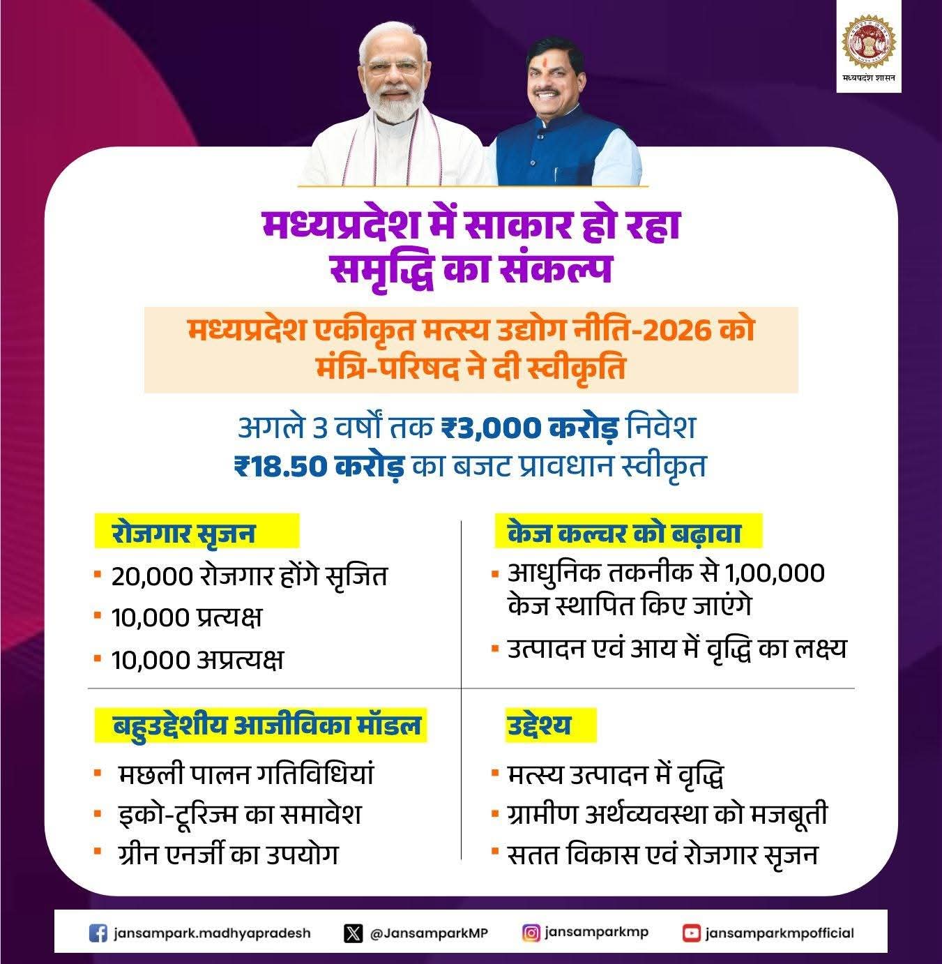 मध्यप्रदेश एकीकृत मत्स्य उद्योग नीति-2026 को मंत्रि-परिषद ने दी स्वीकृति