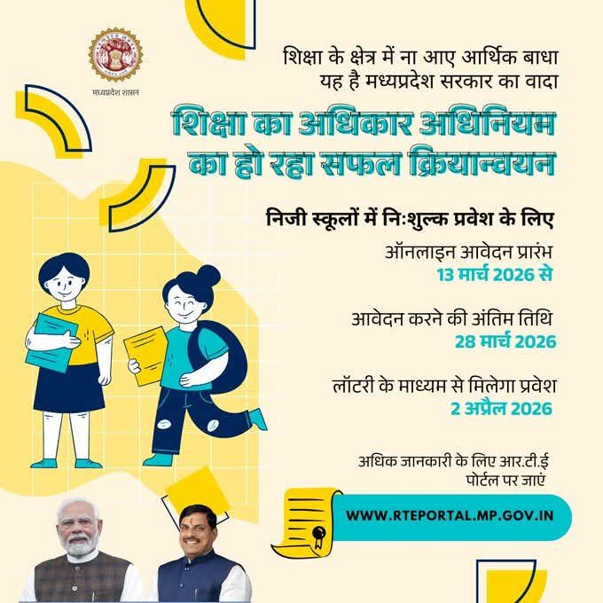 शिक्षा का अधिकार अधिनियम RTE के अंतर्गत निजी स्कूलों में निःशुल्क प्रवेश के लिए ऑनलाइन आवेदन प्रारंभ