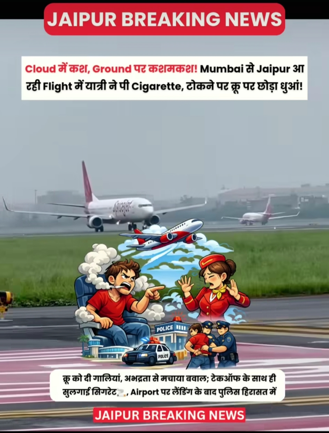 AIMA media New :- Jaipur Breaking News | Mumbai से Jaipur आ रही SpiceJet Flight SG-920 में मंगलवार सुबह एक passenger ने takeoff के तुरंत बाद cigarette जलाने की कोशिश की। Crew members ने रोका तो उसने हंगामा किया और crew के साथ दुर्व्यवहार कर abusive words का इस्तेमाल किया।
