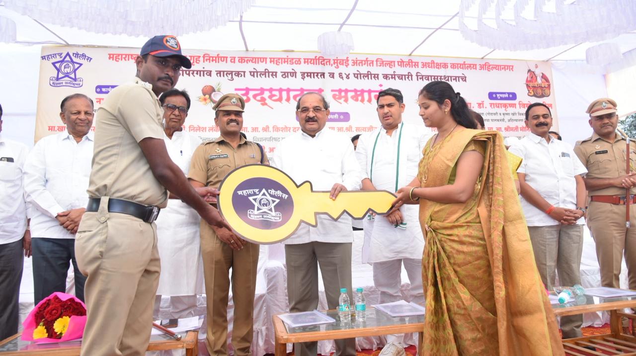 पालकमंत्री श्री. विखे पाटील म्हणाले की, राज्य शासनाच्या धोरणानुसार पोलिसांच्या कल्याणासाठी गृहनिर्माण प्रकल्पांना गती देण्यात आली असून, जिल्हा मुख्यालयात ३२२ निवासस्थानांचे काम सुरू आहे. तसेच कोपरगाव (४८) व पाथर्डी (५४) येथील निवासस्थानांचे काम पूर्ण झाले असून, राहाता व शिर्डी येथे अद्ययावत पोलीस ठाण्यांच्या इमारती उभारण्यात आल्या आहेत. जिल्ह्यातून जाणाऱ्या राष्ट्रीय व समृद्धी महामार्गांमुळे वाढणारी अंमली पदार्थांची तस्करी व गुन्हेगारी रोखण्यासाठी पोलीस दलाचे मनुष्यबळ वाढवणे अत्यावश्यक आहे. याकरिता ५०० अतिरिक्त पोलीस कर्मचाऱ्यांची मागणी शासनाकडे नोंदवण्यात आली आहे.