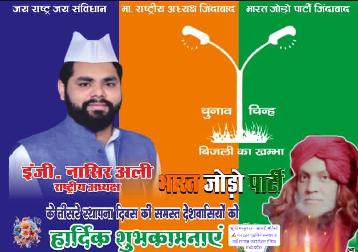 Bharat Jodo Party sthapna divas ,3rd year ka manaya gaya ,pure desh me aur nayi nasal ko leke aage padhne ki baat ki gayi manthan kiya gaya mansuba sucha gaya ki kistarah se nayi nasal apni baat main stream me ake rakhe apni baat ko pure implement karayen aur yuva hone k sath pure desh ko yuva warg me le jayen yahi desh hai jo ki jawano ki mehnat ki wajah se unki taraqqi ki wajah se "jai jawan ,jai kishan "ka nara paya tha aur sab nawjawano hi ki kosis thi ,is se pehle pura desh mil kar taraqqi kara tha to "sone ki chidya " kehlayi thi to kiya fir desh us tarah se nahi honga ,isliye desh k jawano ko aage aana honga taraqqi k liye ,aur is nafrat k bade bade pahadon ko tod k tarrqqi ki baat karen ge to har koi taraqqi kar na chahta hai ,jis se har koi taraqqi se jo ki nispaksh ho without bais ho to khud hi pura desh jude ga aur tarraqqi kare ga yahi hamara desh hona chahiye ...