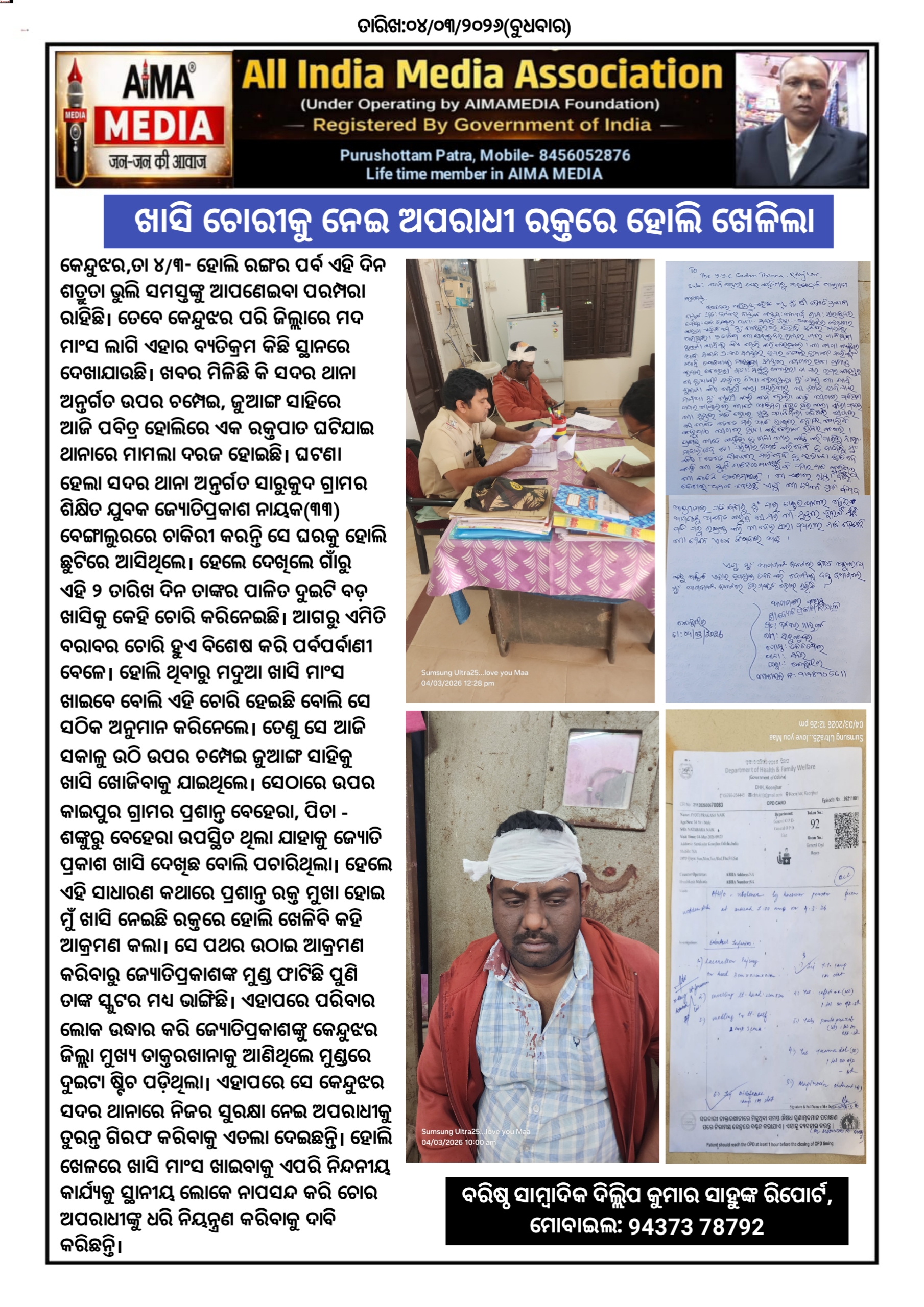 କେନ୍ଦୁଝର, ତା ୪/୩- ହୋଲି ରଙ୍ଗର ପର୍ବ ଏହି ଦିନ ଶତ୍ରୁତା ଭୁଲି ସମସ୍ତଙ୍କୁ ଆପଣେଇବା ପରମ୍ପରା ରାହିଛି। ତେବେ କେନ୍ଦୁଝର ପରି ଜିଲ୍ଲାରେ ମଦ ମାଂସ ଲାଗି ଏହାର ବ୍ୟତିକ୍ରମ କିଛି ସ୍ଥାନରେ ଦେଖାଯାଉଛି। ଖବର ମିଳିଛି କି ସଦର ଥାନା ଅନ୍ତର୍ଗତ ଉପର ଚମ୍ପେଇ, ଜୁଆଙ୍ଗ ସାହିରେ ଆଜି ପବିତ୍ର ହୋଲିରେ ଏକ ରକ୍ତପାତ ଘଟିଯାଇ ଥାନାରେ ମାମଲା ଦରଜ ହୋଇଛି। ଘଟଣା ହେଲା ସଦର ଥାନା ଅନ୍ତର୍ଗତ ସାରୁକୁଦ ଗ୍ରାମର ଶିକ୍ଷିତ ଯୁବକ ଜ୍ୟୋତିପ୍ରକାଶ ନାୟକ(୩୩) ବେଙ୍ଗାଲୁରରେ ଚାକିରୀ କରନ୍ତି ସେ ଘରକୁ ହୋଲି ଛୁଟିରେ ଆସିଥିଲେ । ହେଲେ ଦେଖିଲେ ଗାଁରୁ ଏହି ୨ ତାରିଖ ଦିନ ତାଙ୍କର ପାଳିତ ଦୁଇଟି ବଡ଼ ଖାସିକୁ କେହି ଚୋରି କରିନେଇଛି। ଆଗରୁ ଏମିତି ବରାବର ଚୋରି ହୁଏ ବିଶେଷ କରି ପର୍ବପର୍ବାଣୀ ବେଳେ । ହୋଲି ଥିବାରୁ ମଦୁଆ ଖାସି ମାଂସ ଖାଇବେ ବୋଲି ଏହି ଚୋରି ହେଇଛି ବୋଲି ସେ ସଠିକ ଅନୁମାନ କରିନେଲେ। ତେଣୁ ସେ ଆଜି ସକାଳୁ ଉଠି ଉପର ଚମ୍ପେଇ ଜୁଆଙ୍ଗ ସାହିକୁ ଖାସି ଖୋଜିବାକୁ ଯାଇଥିଲେ। ସେଠାରେ ଉପର କାଇପୁର ଗ୍ରାମର ପ୍ରଶାନ୍ତ ବେହେରା, ପିତା - ଶଙ୍କୁରୁ ବେହେରା ଉପସ୍ଥିତ ଥିଲା ଯାହାକୁ ଜ୍ୟୋତି ପ୍ରକାଶ ଖାସି ଦେଖିଛ ବୋଲି ପଚାରିଥିଲା। ହେଲେ ଏହି ସାଧାରଣ କଥାରେ ପ୍ରଶାନ୍ତ ରକ୍ତ ମୁଖା ହୋଇ ମୁଁ ଖାସି ନେଇଛି ରକ୍ତରେ ହୋଲି ଖେଳିବି କହି ଆକ୍ରମଣ କଲା। ସେ ପଥର ଉଠାଇ ଆକ୍ରମଣ କରିବାରୁ ଜ୍ୟୋତିପ୍ରକାଶଙ୍କ ମୁଣ୍ଡ ଫାଟିଛି ପୁଣି ତାଙ୍କ ସ୍କୁଟର ମଧ୍ୟ ଭାଙ୍ଗିଛି। ଏହାପରେ ପରିବାର ଲୋକ ଉଦ୍ଧାର କରି ଜ୍ୟୋତିପ୍ରକାଶଙ୍କୁ କେନ୍ଦୁଝର ଜିଲ୍ଲା ମୁଖ୍ୟ ଡାକ୍ତରଖାନାକୁ ଆଣିଥିଲେ ମୁଣ୍ଡରେ ଦୁଇଟା ଷ୍ଟିଚ ପଡ଼ିଥିଲା। ଏହାପରେ ସେ କେନ୍ଦୁଝର ସଦର ଥାନାରେ ନିଜର ସୁରକ୍ଷା ନେଇ ଅପରାଧୀକୁ ତୁରନ୍ତ ଗିରଫ କରିବାକୁ ଏତଲା ଦେଇଛନ୍ତି। ହୋଲି ଖେଳରେ ଖାସି ମାଂସ ଖାଇବାକୁ ଏପରି ନିନ୍ଦନୀୟ କାର୍ଯ୍ୟକୁ ସ୍ଥାନୀୟ ଲୋକେ ନାପସନ୍ଦ କରି ଚୋର ଅପରାଧୀଙ୍କୁ ଧରି ନିୟନ୍ତ୍ରଣ କରିବାକୁ ଦାବି କରିଛନ୍ତି।