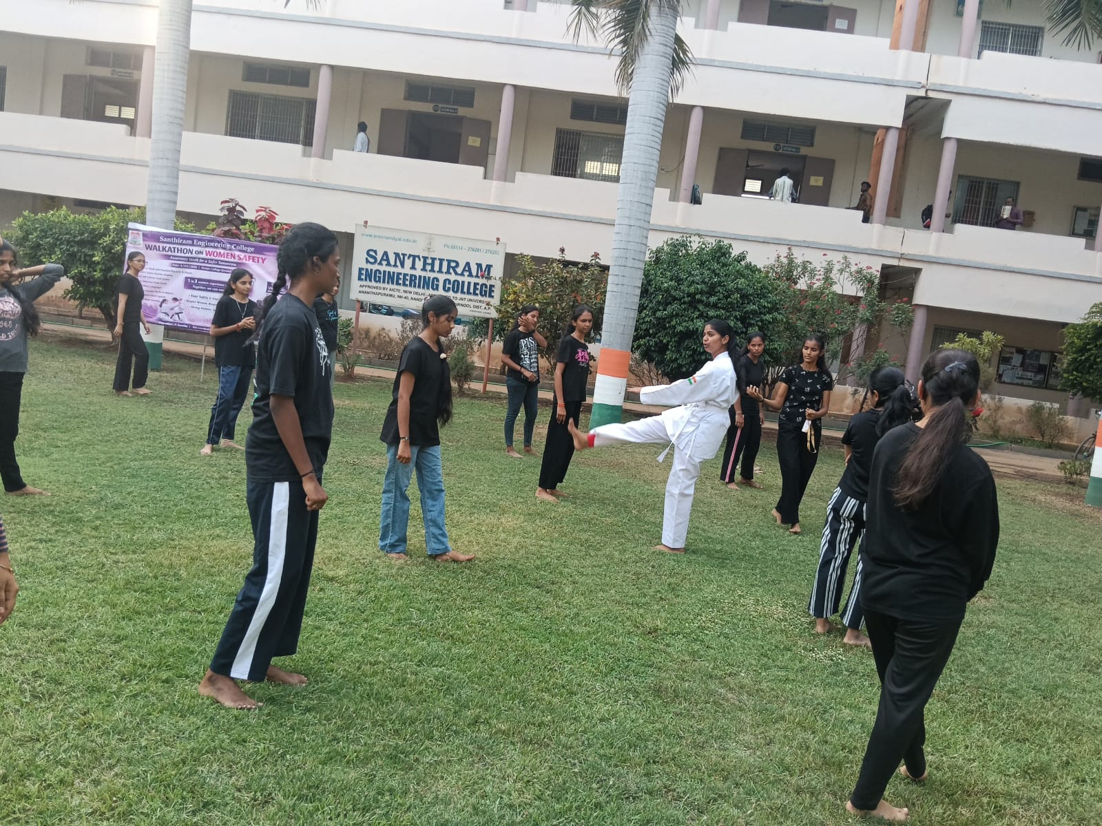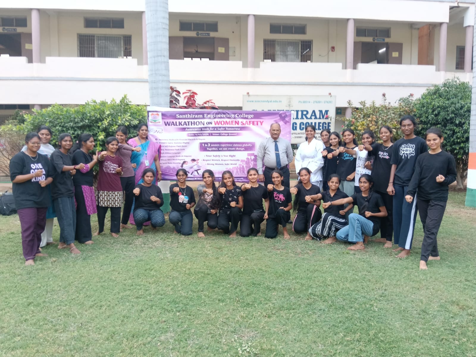 పాణ్యం (AIMA MEDIA): శాంతిరామ్ ఇంజినీరింగ్ కళాశాలలో మార్చి 4వతేదీన కళాశాల ప్రాంగణంలో “మహిళల భద్రత – సురక్షిత రేపటి కోసం అవగాహన నడక” అనే థీమ్‌తో ఘనంగా వాక్‌థాన్ కార్యక్రమం నిర్వహించారు. మహిళల భద్రత, ఆత్మరక్షణ మరియు సమాజంలో మహిళలకు గౌరవం కల్పించాల్సిన అవసరంపై అవగాహన కల్పించడం ఈ కార్యక్రమం ప్రధాన ఉద్దేశ్యం.ఈ కార్యక్రమానికి కళాశాల ప్రిన్సిపాల్ డా. ఎం.వి. సుబ్రహ్మణ్యం ముఖ్య అతిథిగా హాజరై విద్యార్థులను ఉద్దేశించి ప్రసంగించారు. తన ప్రసంగంలో మహిళలు ఆత్మరక్షణ విద్యను తప్పనిసరిగా నేర్చుకోవాలని, ధైర్యంగా ముందుకు సాగాలని, సమాజంలో ప్రతి ఒక్కరు మహిళల భద్రతకు బాధ్యత వహించాలని తెలిపారు. ఆత్మరక్షణ శిక్షణ మహిళలకు ఆత్మవిశ్వాసాన్ని పెంపొందిస్తుందని ఆయన అన్నారు.మహిళా సాధికారత కమిటీ (WEC) సమన్వయకర్త శ్రీమతి వి. నాగమణి కూడా కార్యక్రమానికి హాజరై విద్యార్థులను ప్రోత్సహించారు. కార్యక్రమం విజయవంతంగా నిర్వహించబడటంలో ఆమె కీలక పాత్ర పోషించారు.వాక్‌థాన్‌లో విద్యార్థులు శక్తివంతమైన ప్లకార్డులు, నినాదాలతో అవగాహన కల్పించారు. మహిళల భద్రత గణాంకాల ప్రదర్శన, క్విక్ సెల్ఫ్ డిఫెన్స్ ఫ్లాష్ డెమో, వంటి కార్యక్రమాలు ప్రత్యేక ఆకర్షణగా నిలిచాయి. “నీ భద్రత నీ హక్కు”, “మహిళలకు గౌరవం – మానవత్వానికి గౌరవం”, “బలమైన మహిళలు – సురక్షిత ప్రపంచం” వంటి నినాదాలు అందరినీ ఆకట్టుకున్నాయి.ప్రత్యేకంగా విద్యార్థినులు ప్రదర్శించిన కరాటే (ఆత్మరక్షణ) ప్రదర్శన కార్యక్రమానికి హైలైట్‌గా నిలిచింది. IEEE చైర్ మిస్ పి. స్వేత నాయకత్వంలో ఈ మహిళల భద్రత కార్యక్రమం విజయవంతంగా నిర్వహించారు. విద్యార్థులకు కరాటే శిక్షణ అందిస్తూ, కార్యక్రమాన్ని సమర్థవంతంగా నిర్వహించారు.