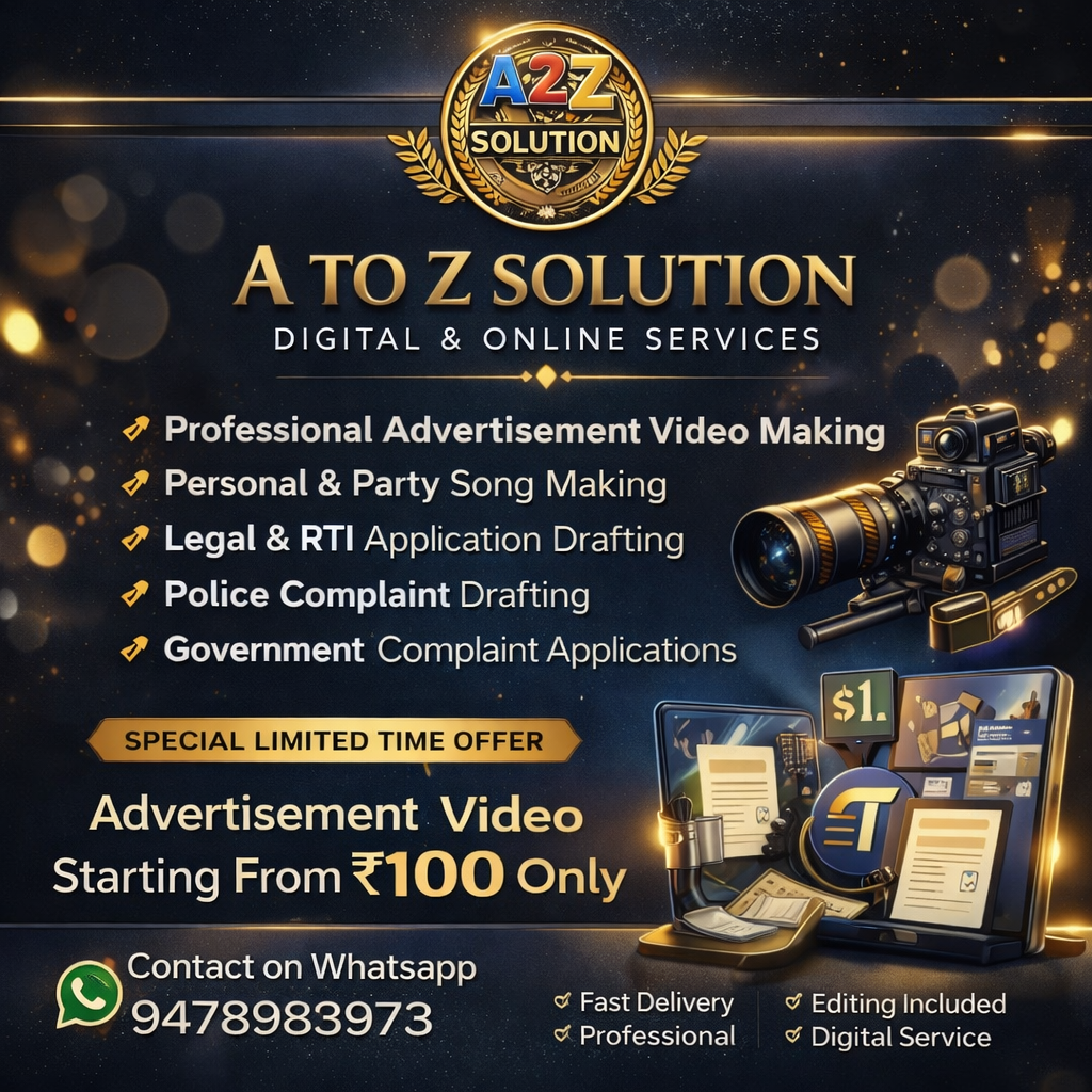 डिजिटल दौर में हर व्यापार को ऑनलाइन पहचान दिलाने के लिए A to Z Solution – Digital & Online Services ने एक नई सेवा शुरू की है। अब छोटे और बड़े सभी दुकानदार अपने बिजनेस के लिए प्रोफेशनल Advertisement Video बनवा सकते हैं।