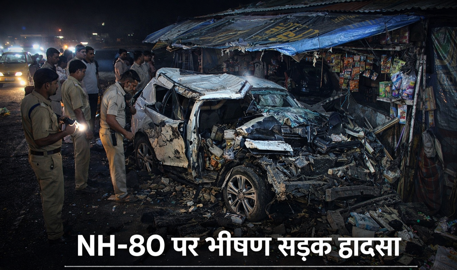 NH-80 पर भीषण सड़क हादसा: तेज रफ्तार कार अनियंत्रित होकर गुमटी से टकराई, 2 की मौत, 7 घायल