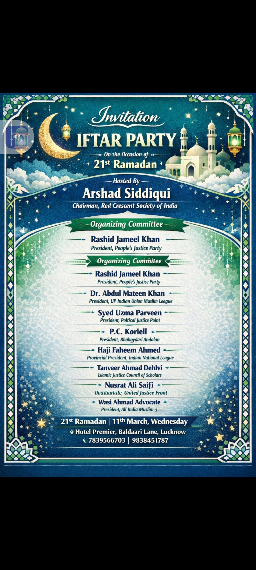 रोज़ा इफ्तार के अवसर पर मौक़ा: 21वां रमज़ान मुबारक 📅 तिथि 21वां रमज़ान मुबारक 11 मार्च, बुधवारराशिद जमील ख़ान अध्यक्ष पीपल्स जस्टिस पार्टी.