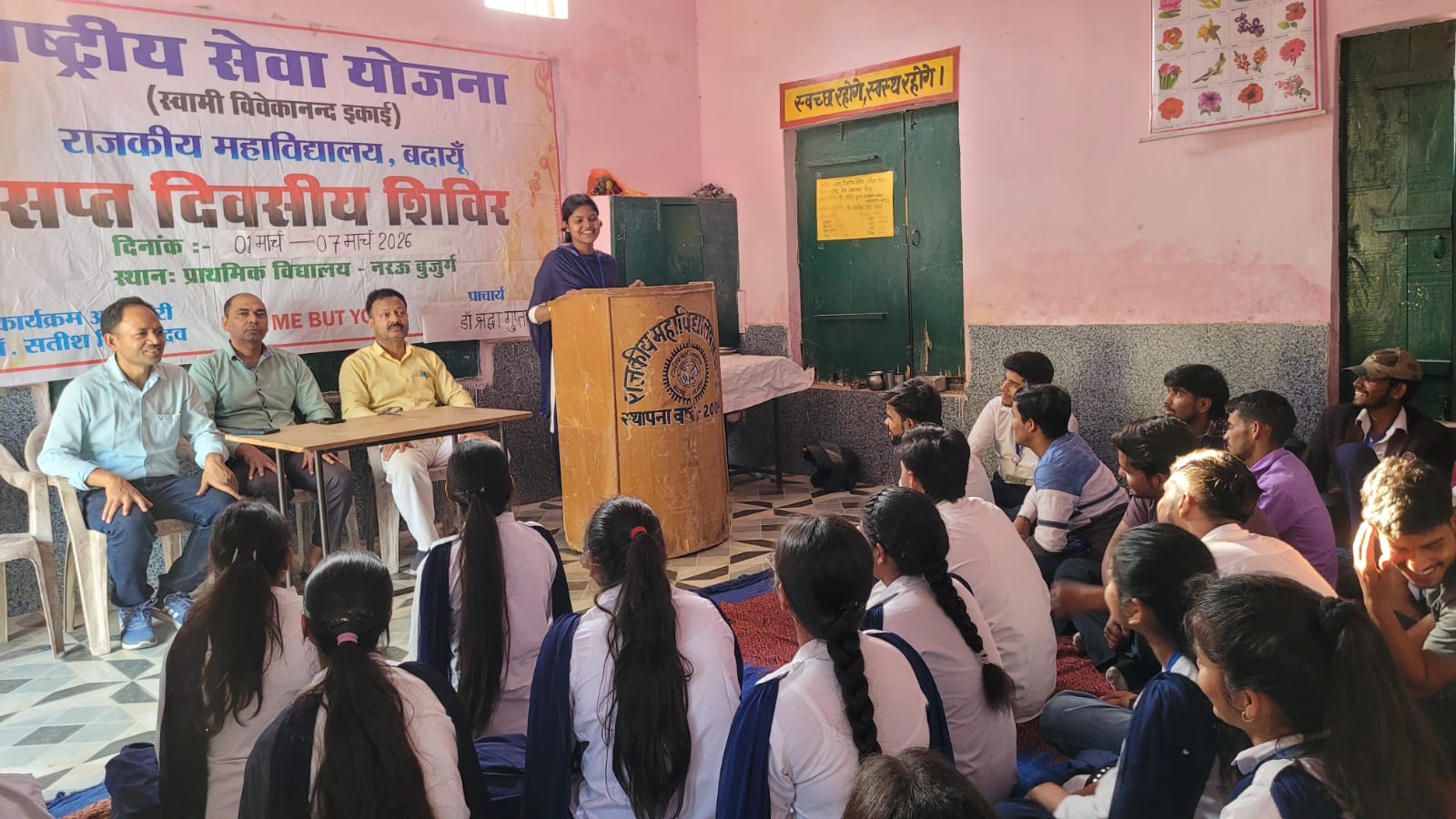 बदायूं: आवास विकास स्थित राजकीय महाविद्यालय बदायूं की राष्ट्रीय सेवा योजना (एनएसएस) विवेकानंद इकाई द्वारा ग्राम नरऊ बुजुर्ग में आयोजित सात दिवसीय विशेष शिविर में दो दिन के होली अवकाश के बाद पुनः प्रारम्भ शिविर में तृतीय दिवसको 'अखंड राष्ट्र संकल्पना दिवस' के रूप में मनाया गया।कार्यक्रम में मुख्य अतिथि के रूप में राजकीय महिला महाविद्यालय घंटाघर के गणित विभागाध्यक्ष डॉ. सतीश कुमार ने जम्मू-कश्मीर के भारत में विलय के बाद की ऐतिहासिक परिस्थितियों पर प्रकाश डाला। स्वयंसेवियों ने विषय से संबंधित जानकारी को डोर टू डोर सर्वेक्षण कर प्रसारित किया।