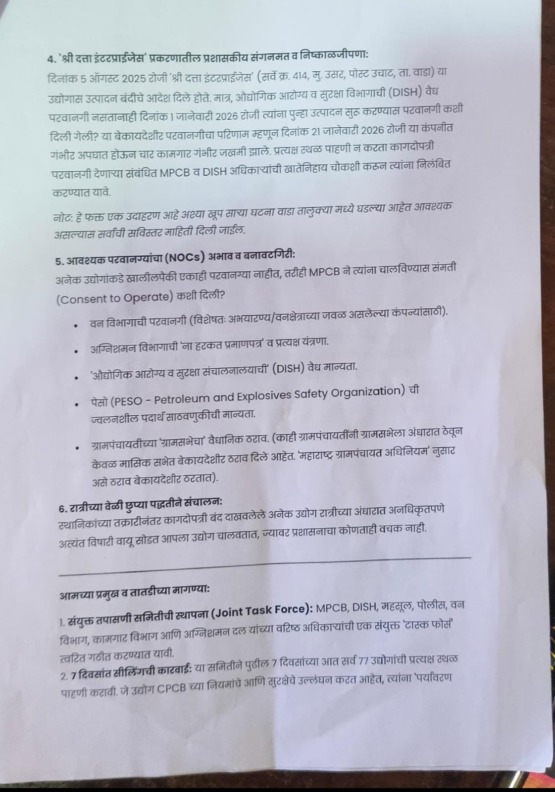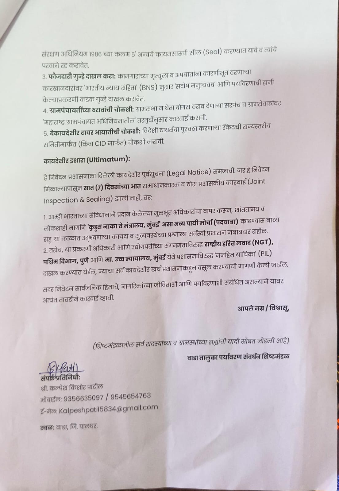 स्थानिक सामाजिक कार्यकर्ते कल्पेश पाटील आणि 'वाडा तालुका पर्यावरण संवर्धन शिष्टमंडळा'ने याविरोधात दंड थोपटले आहेत. पालघर जिल्हाधिकारी आणि वाडा प्रांताधिकाऱ्यांना निवेदन देऊन तत्काळ कारवाईची मागणी करण्यात आली आहे. प्रदूषण नियंत्रण मंडळासह सर्व यंत्रणा झोपेचे सोंग घेत आहेत, पण जनता आता जागी झाली आहे. आमच्या मागण्या मान्य न झाल्यास आम्ही कुडूस नाका ते मुंबई मंत्रालय असा पायी मोर्चा काढून न्यायाची मागणी करू," असा इशारा कल्पेश पाटील यांनी दिला आहे.