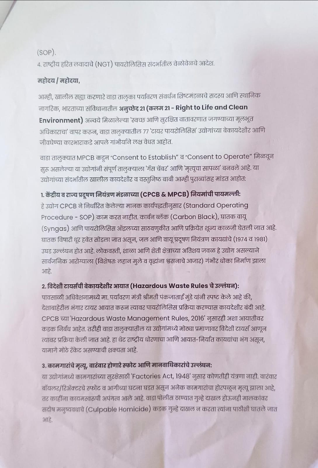 वाडा तालुक्यातील औद्योगिक विकासाचा फायदा स्थानिकांना रोजगार मिळण्यासाठी होईल, अशी अपेक्षा होती. मात्र, सद्यस्थितीत तालुक्यातील चित्र अत्यंत भयावह झाले आहे. नियमांचे उल्लंघन करून सुरू असलेल्या ७७ टायर पायरॉलिसिस कारखान्यांनी तालुक्याचा 'गळा घोटला' असून, प्रदूषणासह कामगारांच्या सुरक्षेचा प्रश्न ऐरणीवर आला आहे.