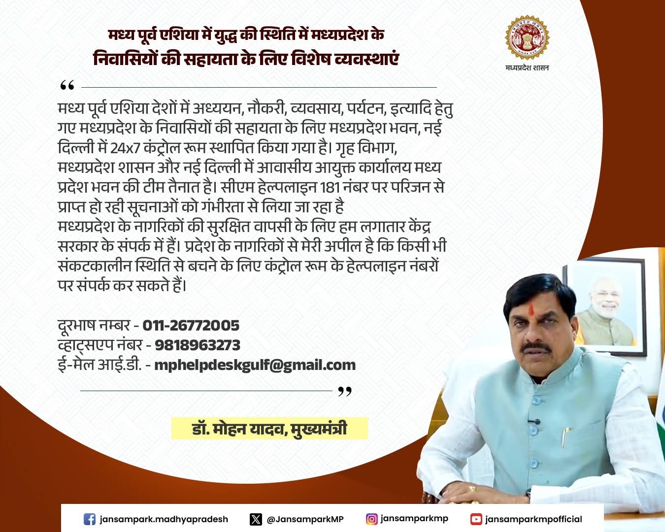 मध्यप्रदेश के नागरिकों की सुरक्षित वापसी के लिए हम लगातार केंद्र सरकार के संपर्क में हैं। प्रदेश के नागरिकों से मेरी अपील है कि किसी भी संकटकालीन स्थिति से बचने के लिए कंट्रोल रूम के हेल्पलाइन नंबरों पर संपर्क कर सकते हैं।