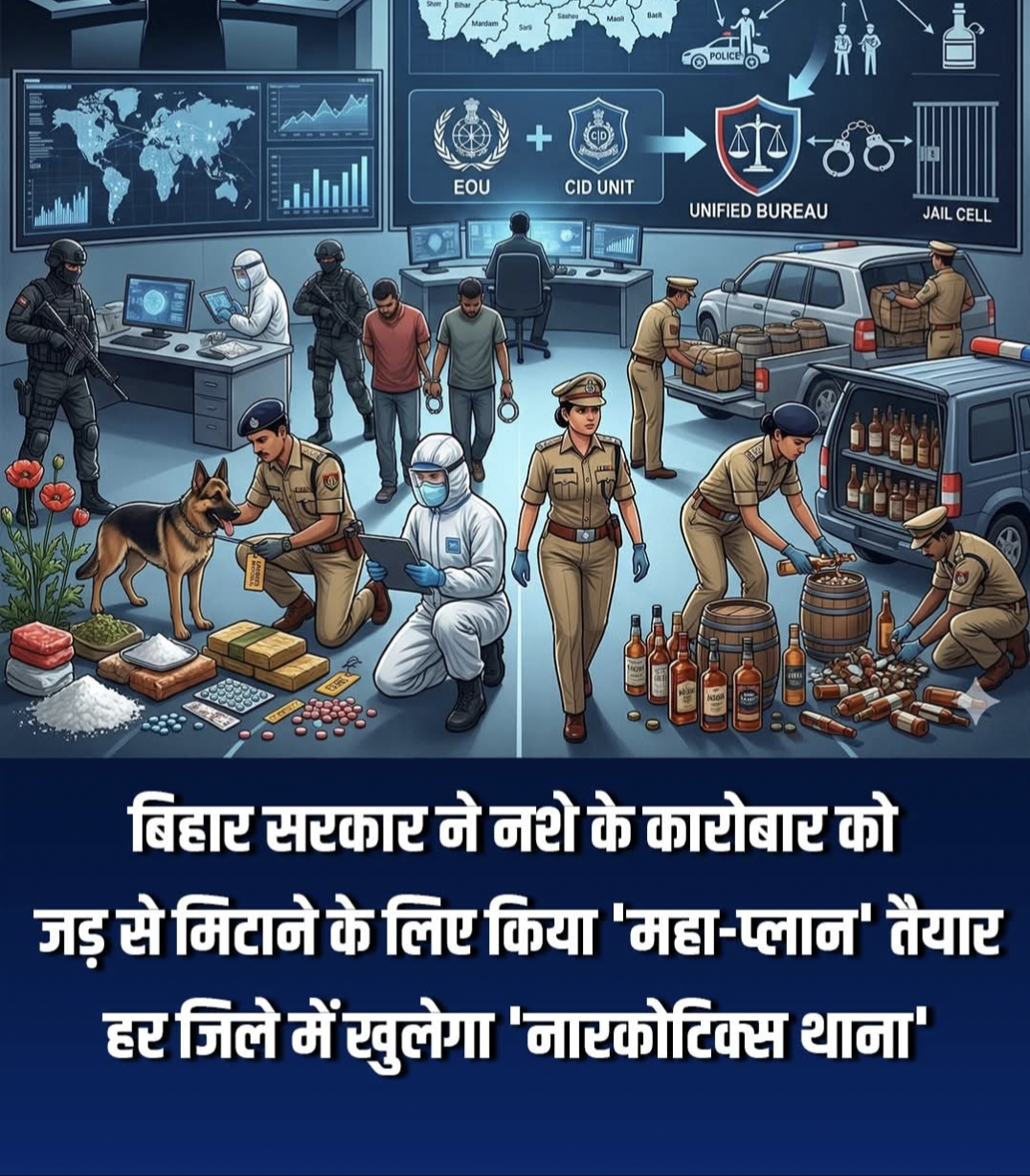 बिहार सरकार ने राज्य में बढ़ते नशे के कारोबार को जड़ से मिटाने के लिए एक 'महा-प्लान' तैयार किया है। अब राज्य के हर जिले में नारकोटिक्स थाना खोला जाएगा। इसका उद्देश्य मादक पदार्थों (ड्रग्स) से जुड़े मामलों की जांच में तेजी लाना और बड़े सिंडिकेट को जल्द से जल्द सलाखों के पीछे पहुँचाना है।