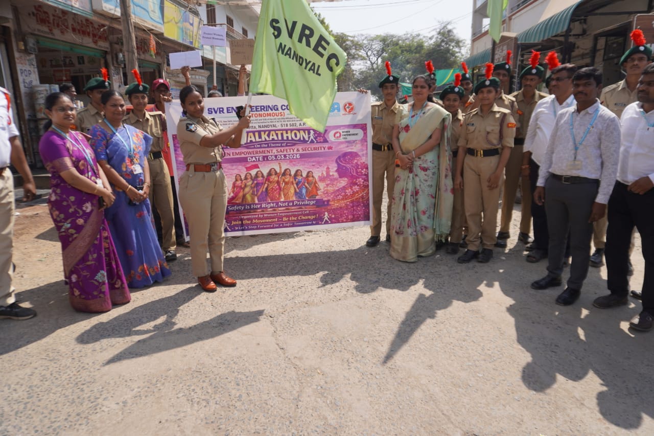 నంద్యాల (AIMA MEDIA): 2026 అంతర్జాతీయ మహిళా దినోత్సవ వారోత్సవాలలో భాగంగా నంద్యాల పట్టణ కేంద్రంలో SVR ఇంజనీరింగ్ కళాశాల వారి ఆధ్వర్యంలో నిర్వహించే మహిళా చైతన్యానికి ‘2కే వాకథాన్* కార్యాక్రమానికి ముఖ్య అతిథిగా హాజరై లాంఛనంగా జెండా ఊపి వాకథాన్ ను ప్రారంభించారు.ఈ సంధర్భంగా M. జావళి మాట్లాడుతూ ఆడబిడ్డల రక్షణే ప్రథమ కర్తవ్యంగా, వారి ఆత్మగౌరవానికి అండగా నిలిచేందుకు,సమాజంలో మహిళా సాధికారత, భద్రత, సమానత్వం మరియు నాయకత్వ స్ఫూర్తిని ప్రోత్సహించడానికి వాకథాన్‌ కార్యాక్రమంను పద్మావతి నగర్ ఆర్చ్ నుండి మున్సిపల్ కార్యాలయం వరకు నిర్వహించడం జరిగిందని తెలిపారు.ఈ కార్యక్రమంలో నంద్యాల సబ్ డివిజన్ ASPతో పాటు SVR ఇంజనీరింగ్ కళాశాల అధ్యాపకులు,NCC విధ్యార్థులు,కళాశాల విధ్యార్థినులు మరియు మహిళా శక్తిని చాటిచెప్పే శక్తి టీమ్ సభ్యులు పాల్గొన్నారు.