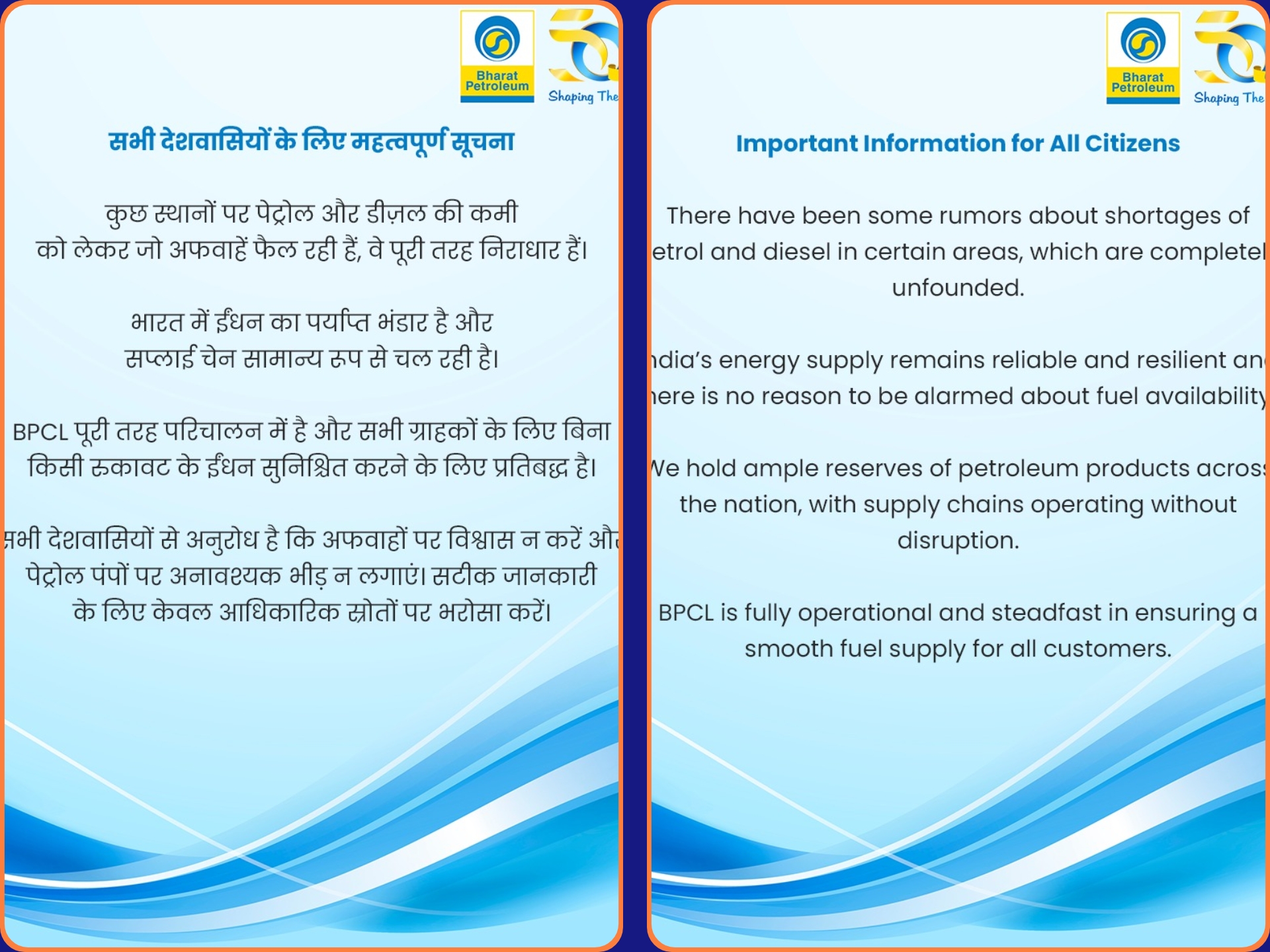 BPCL पूरी तरह परिचालन में है और निर्बाध ईंधन आपूर्ति सुनिश्चित करने के लिए प्रतिबद्ध है। कृपया अफवाहों पर विश्वास न करें, पेट्रोल पंपों पर भीड़ न लगाएं और जानकारी के लिए केवल आधिकारिक स्रोतों पर ही भरोसा करें।