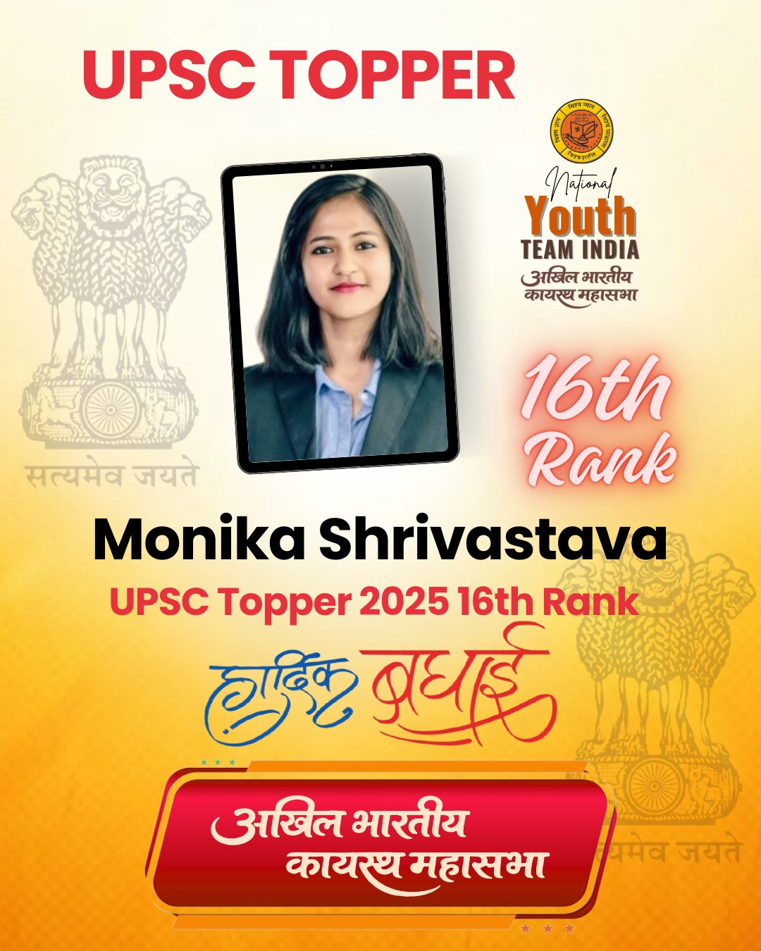 संघ लोक सेवा आयोग (UPSC) परीक्षा के घोषित परिणामों में कायस्थ समाज के होनहार युवाओं ने अपनी प्रतिभा और परिश्रम से देशभर में समाज का मान बढ़ाया है।