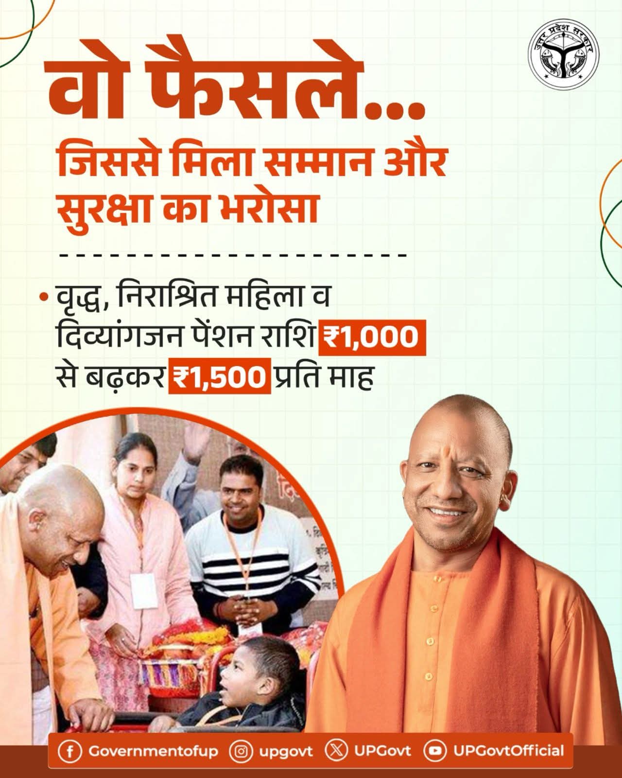 प्रदेश की जनता के लिए बड़ी राहत भरी खबर सामने आई है। मुख्यमंत्री Yogi Adityanath के नेतृत्व में उत्तर प्रदेश सरकार ने वृद्ध, निराश्रित महिलाओं और दिव्यांगजनों की पेंशन राशि में बढ़ोतरी का बड़ा फैसला लिया है।