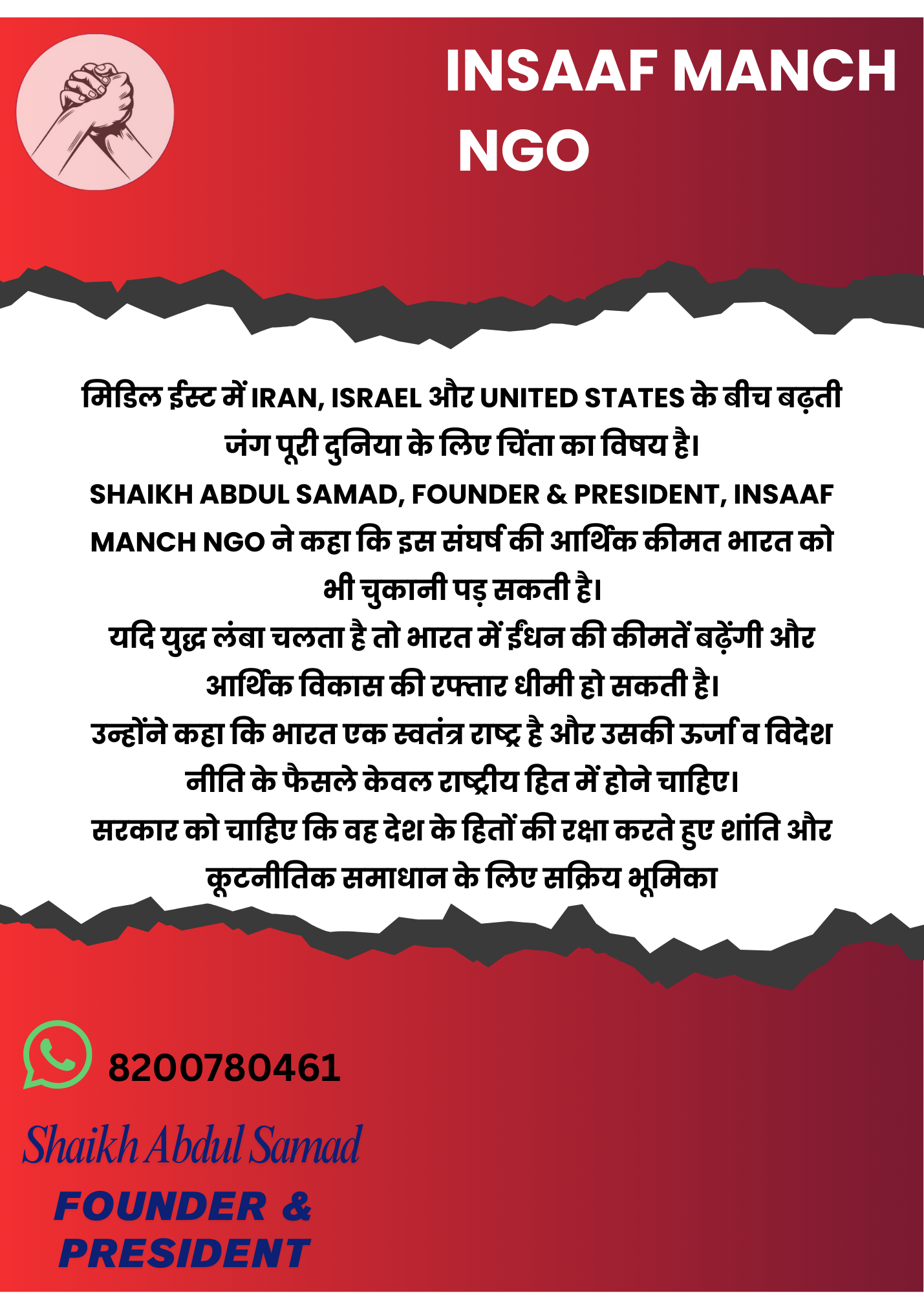मिडिल ईस्ट में बढ़ते युद्ध के हालात पर Insaaf Manch NGO के Founder & President Shaikh Abdul Samad ने गहरी चिंता व्यक्त की है। उन्होंने कहा कि Iran, Israel और United States के बीच बढ़ता सैन्य तनाव केवल क्षेत्रीय संकट नहीं है, बल्कि इसका असर पूरी दुनिया की अर्थव्यवस्था पर पड़ेगा।