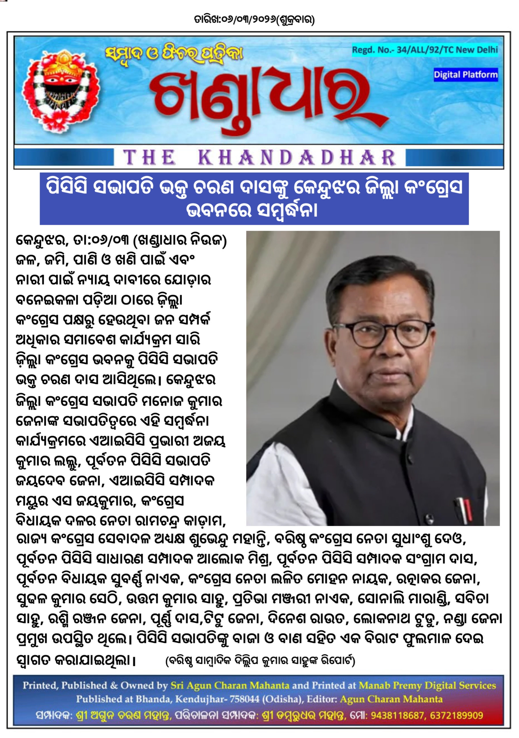 ପିସିସି ସଭାପତି ଭକ୍ତ ଚରଣ ଦାସଙ୍କୁ କେନ୍ଦୁଝର ଜିଲ୍ଲା କଂଗ୍ରେସ ଭବନରେ ସମ୍ବର୍ଦ୍ଧନା।