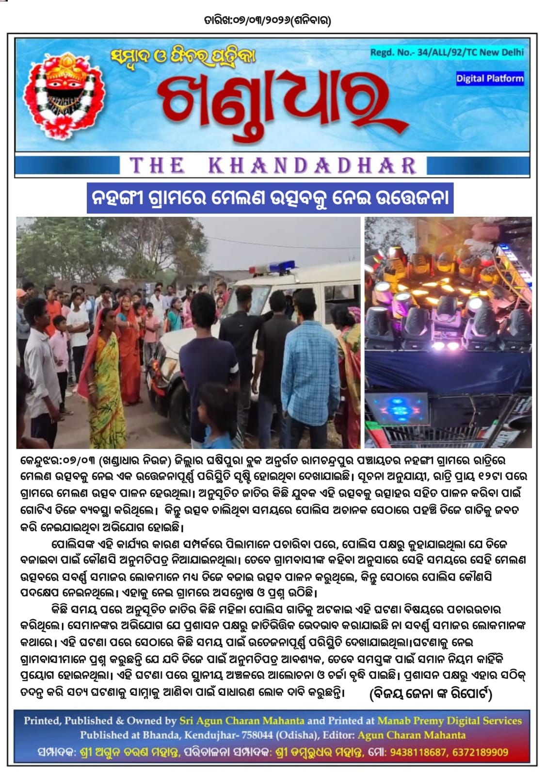 କେନ୍ଦୁଝର ଜିଲ୍ଲାର ଘଷିପୁରା ବ୍ଲକ ଅନ୍ତର୍ଗତ ରାମଚନ୍ଦ୍ରପୁର ପଞ୍ଚାୟତର ନହଙ୍ଗୀ ଗ୍ରାମରେ ରାତ୍ରିରେ ମେଲଣ ଉତ୍ସବକୁ ନେଇ ଏକ ଉତ୍ତେଜନାପୂର୍ଣ୍ଣ ପରିସ୍ଥିତି ସୃଷ୍ଟି ହୋଇଥିବା ଦେଖାଯାଇଛି। ସୂଚନା ଅନୁଯାୟୀ, ରାତ୍ରି ପ୍ରାୟ ୧୨ଟା ପରେ ଗ୍ରାମରେ ମେଲଣ ଉତ୍ସବ ପାଳନ ହେଉଥିଲା। ଅନୁସୂଚିତ ଜାତିର କିଛି ଯୁବକ ଏହି ଉତ୍ସବକୁ ଉତ୍ସାହର ସହିତ ପାଳନ କରିବା ପାଇଁ ଗୋଟିଏ ଡିଜେ ବ୍ୟବସ୍ଥା କରିଥିଲେ। କିନ୍ତୁ ଉତ୍ସବ ଚାଲିଥିବା ସମୟରେ ପୋଲିସ ଅଚାନକ ସେଠାରେ ପହଞ୍ଚି ଡିଜେ ଗାଡିକୁ ଜବତ କରି ନେଇଯାଇଥିବା ଅଭିଯୋଗ ହୋଇଛି।