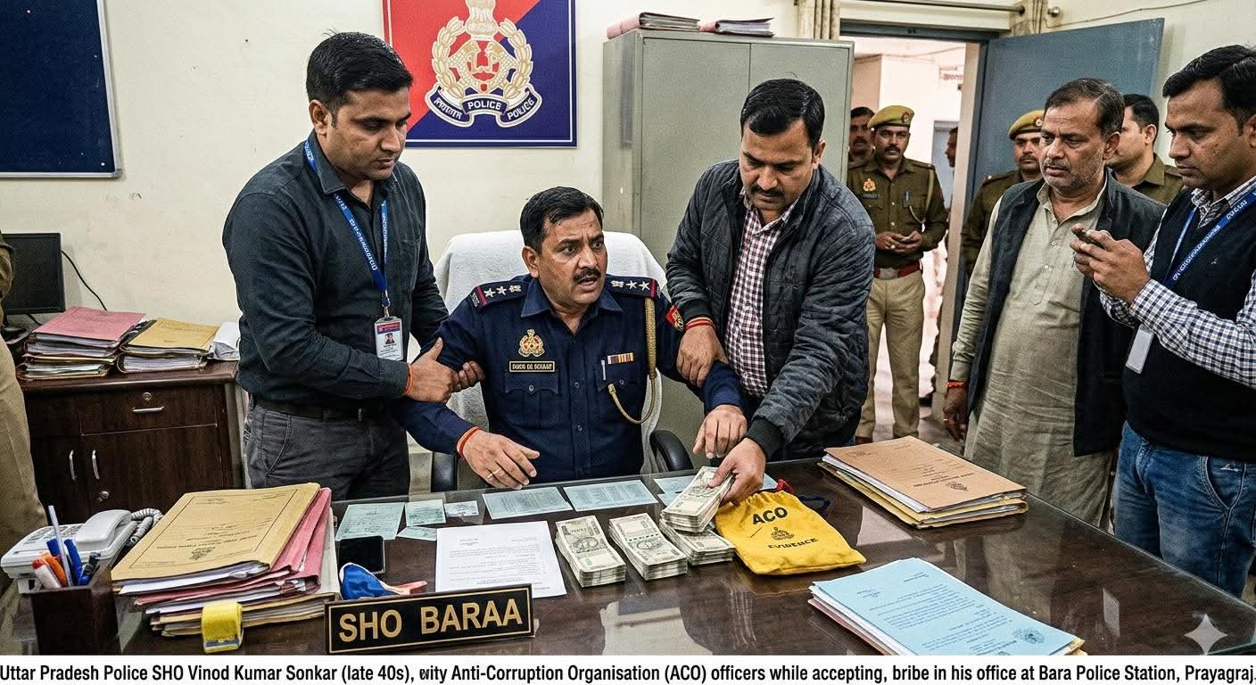 यूपी के प्रयागराज के बारा थाना प्रभारी SHO विनोद कुमार सोनकर को एंट्री कॉरपोरेशन टीम ने 75000 की रिश्वत लेते रंगे हाथ गिरफ्तार कर लिया आरोप है कि थानेदार ने रेप के केस में फाइल रिपोर्ट लगाने के बदले अपने ही ऑफिस में यह रकम कैश में ली थी बताया जा रहा है कि शिकायतकर्ता के खिलाफ पहले से फर्जी केश दर्ज था जो की कथित तौर पर सेटिंग के जरिए दर्ज कराया गया था इसी केस को निपटने के नाम पर रिश्वत की मांग की गई थी जिसके शिकायत पर एंट्री का ऑपरेशन ने जाल बिछाकर कार्रवाई की