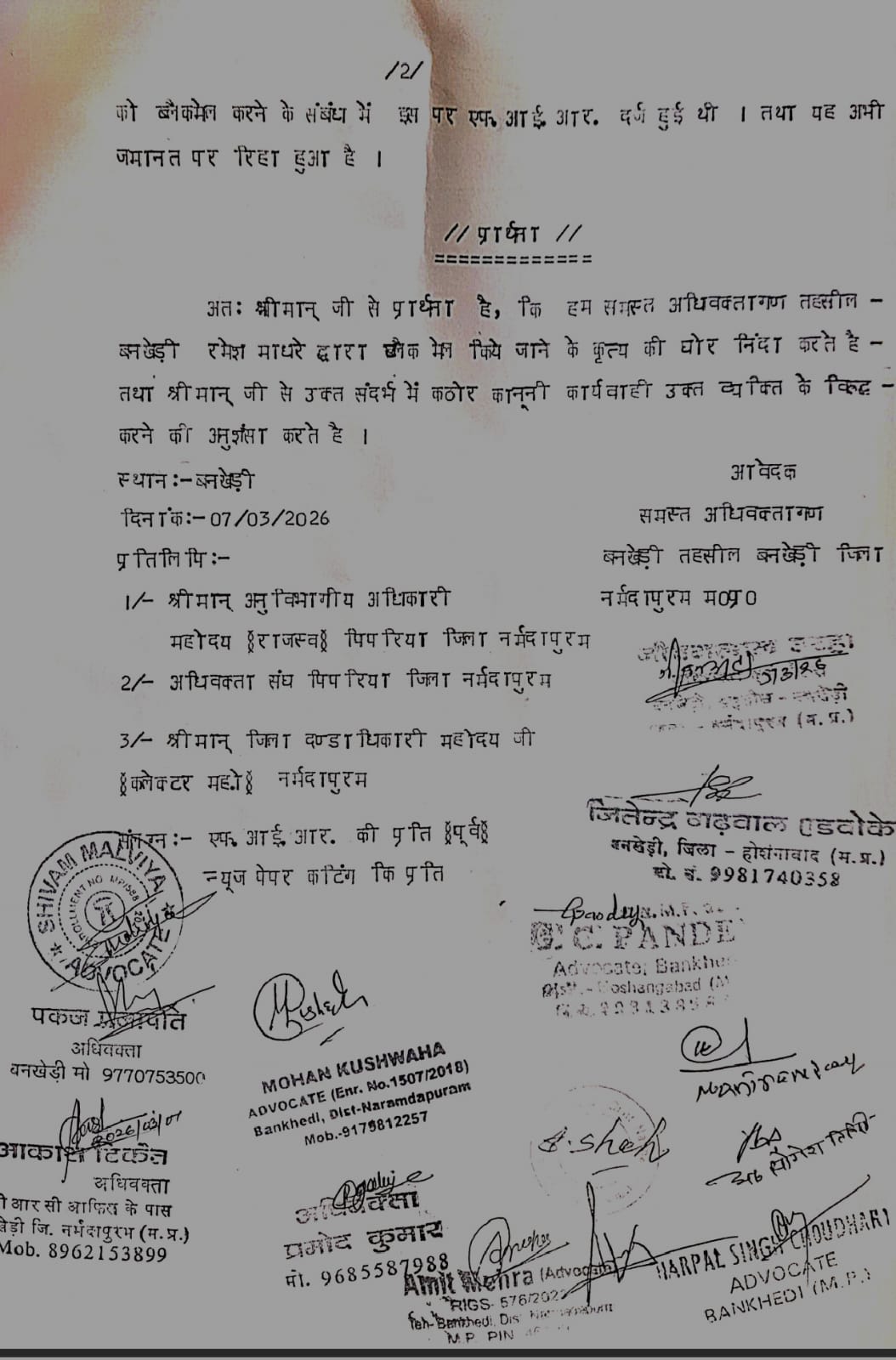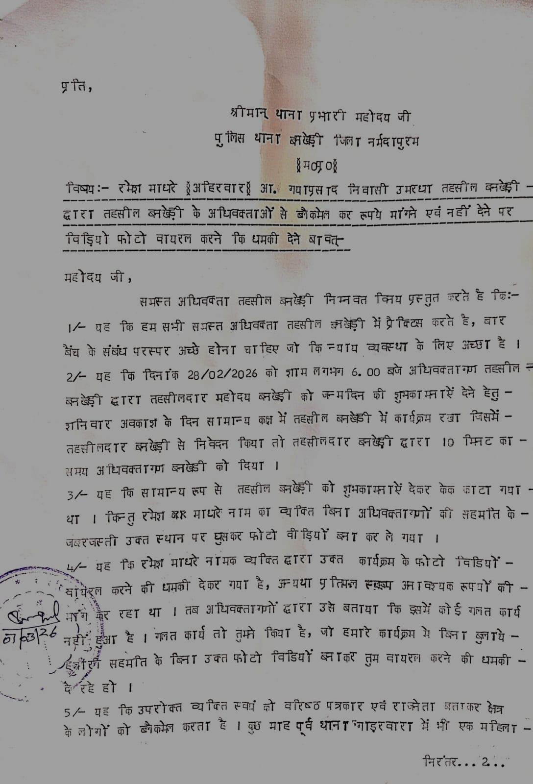 बनखेडी तहसीलदार का तहसील कार्यालय में जन्मदिन मनाने का विवाद गहराता जा रहा है । उमरधा के रमेश माधूरे ने 1 मार्च को सोशल मीडिया में विडियो वायरल किया कि तहसीलदार अंजु लोधी ने अधिवक्ता संघ और तहसील स्टाफ के साथ तहसील कार्यालय में जन्मदिन मनाया । रमेश माधूरे द्वारा चलाई गई न्यूज के अनुसार तहसील में न्यायालय की गरिमा भंग हुई है । जन्मदिन मनाने के साथ दिन बाद अधिवक्ता संघ ने बनखेडी थाने में रमेश माधूरे के विरुद्ध अधिवक्ताओं ने ज्ञापन सौंपा जिसमें आरोप लगाया कि रमेश द्वारा जबरन तहसील कार्यालय में घुसकर स्वयं को पत्रकार एवं नेता बताकर विडियो बनाया और वायरल न करने के बदले पैसो की डिमांड की है । अधिवक्ता संघ ने रमेश माधुरे पर कार्यवाही करने के लिए बनखेड़ी टीआई विजय सनस को ज्ञापन सौंपा। ज्ञात होवे कि शिकायती पत्र के अनुसार, घटना बीती 28 फरवरी 2026 की है। शाम करीब 6:00 बजे तहसील बनखेड़ी के समस्त अधिवक्ताओं ने शनिवार अवकाश के दिन सामान्य कक्ष में तहसीलदार बनखेड़ी को जन्मदिन की शुभकामनाएं देने हेतु तहसील कार्यालय में कार्यक्रम आयोजित किया गया। जिसमें केक काटा और नाश्ता वितरण किया गया था। ज्ञापन सौंपने में एडवोकेट जीवन ऊरहा , अंकित दुबे, जितेंद्र गढ़वाल, पंकज प्रजापति, मोहन कुशवाहा, आकाश टिकैत, गफूर खान, शिवम मालवीय, अमित मेहरा, प्रमोद कुमार, जी.सी. पांडे और हरपाल सिंह चौधरी सहित अनेक लोग मौजूद थे ।