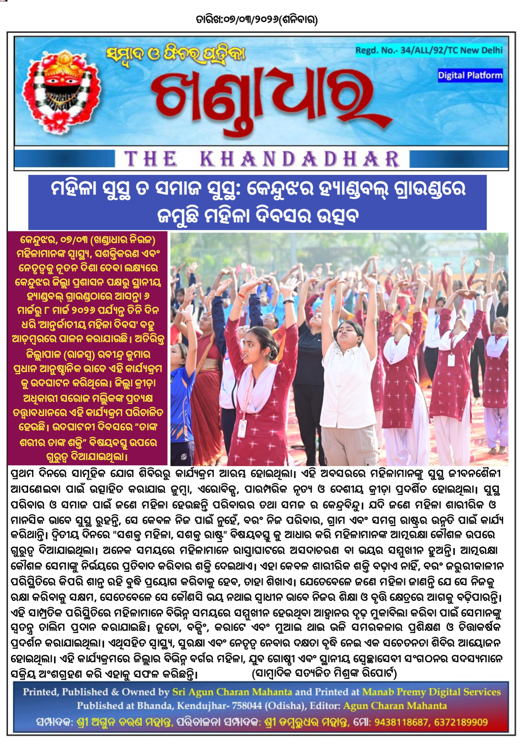 ମହିଳା ସୁସ୍ଥ ତ ସମାଜ ସୁସ୍ଥ: କେନ୍ଦୁଝର ହ୍ୟାଣ୍ଡବଲ୍ ଗ୍ରାଉଣ୍ଡରେ ଜମୁଛି ମହିଳା ଦିବସର ଉତ୍ସବ"।
