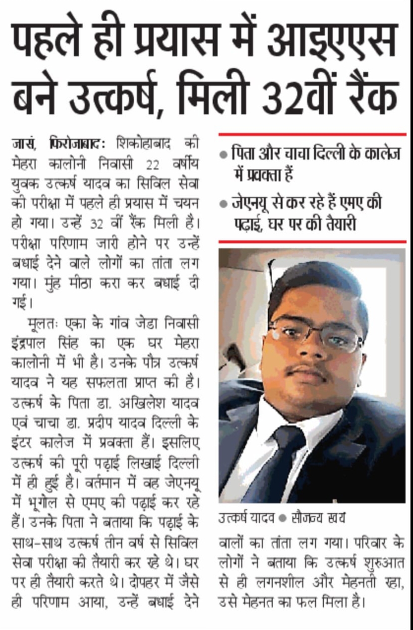 शिकोहाबाद की मेहरा कॉलोनी में रहने वाले उत्कर्ष यादव ने IAS मै 32 वी रैंक हासिल की उनका पुराना घर नगर पंचायत एका के जेडा मै मौजूद है