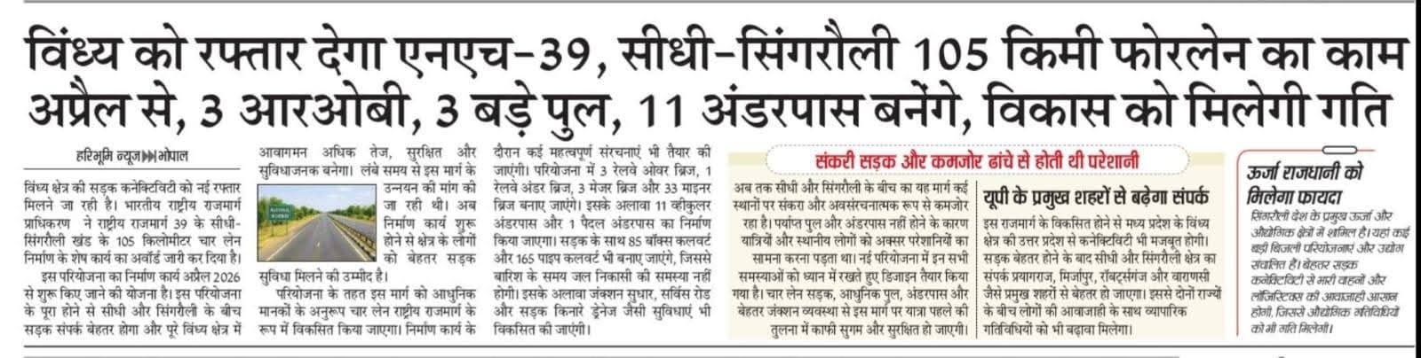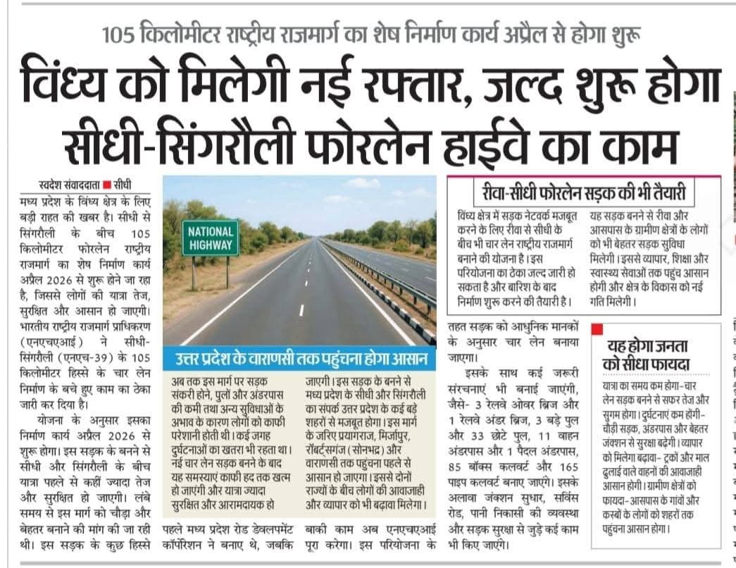 NH 39 देगा विंध्य को रफ्तार, अप्रैल से शुरू होगा सीधी-सिंगरौली फोरलेन का काम