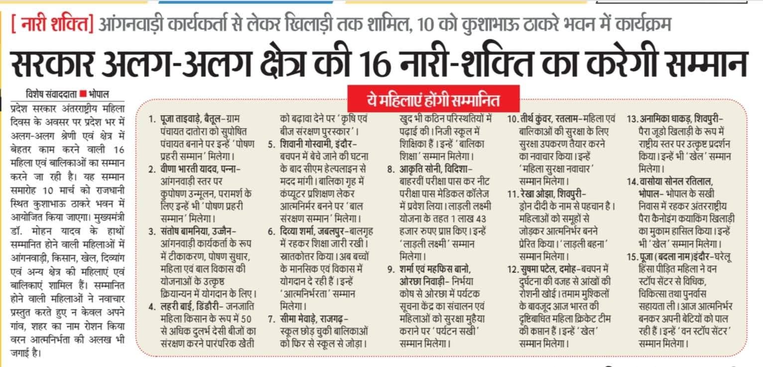मध्यप्रदेश सरकार विभिन्न क्षेत्रों में उत्कृष्ट कार्य करने वाली 16 नारी-शक्ति का करेगी सम्मान
